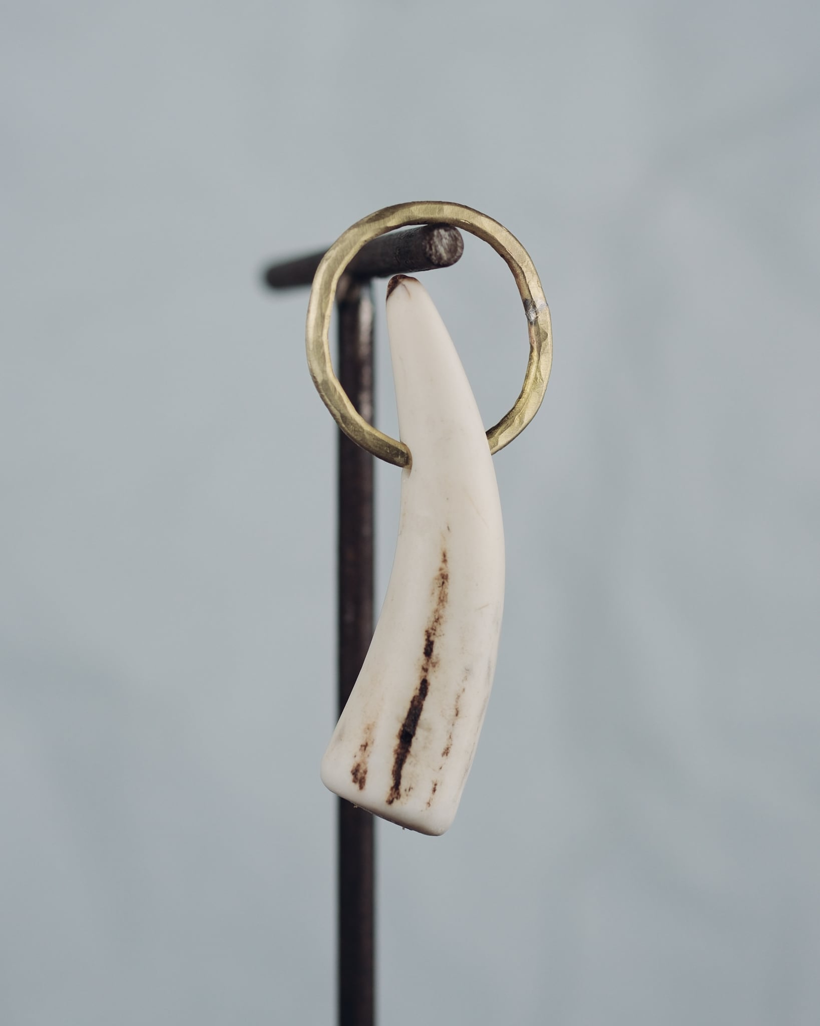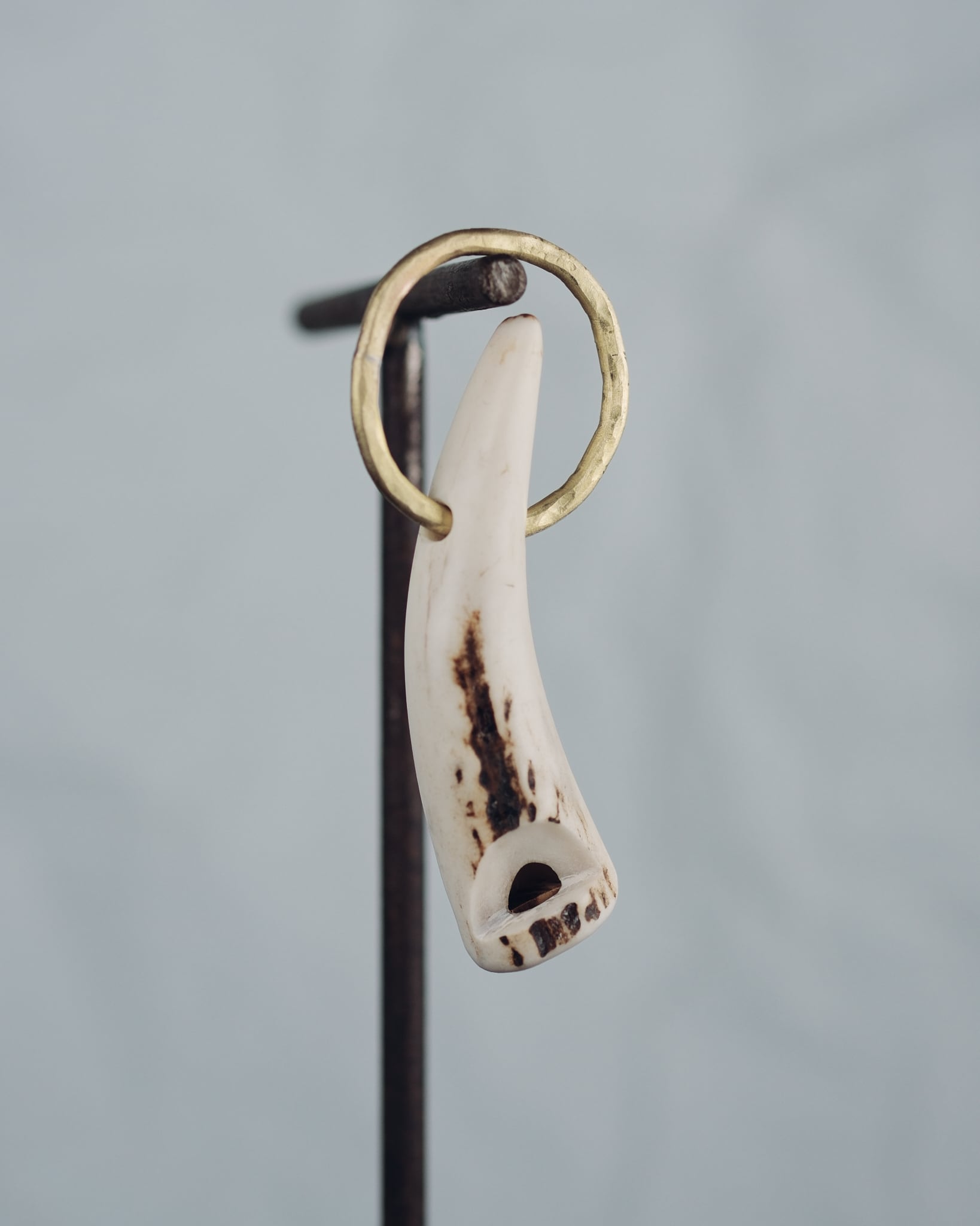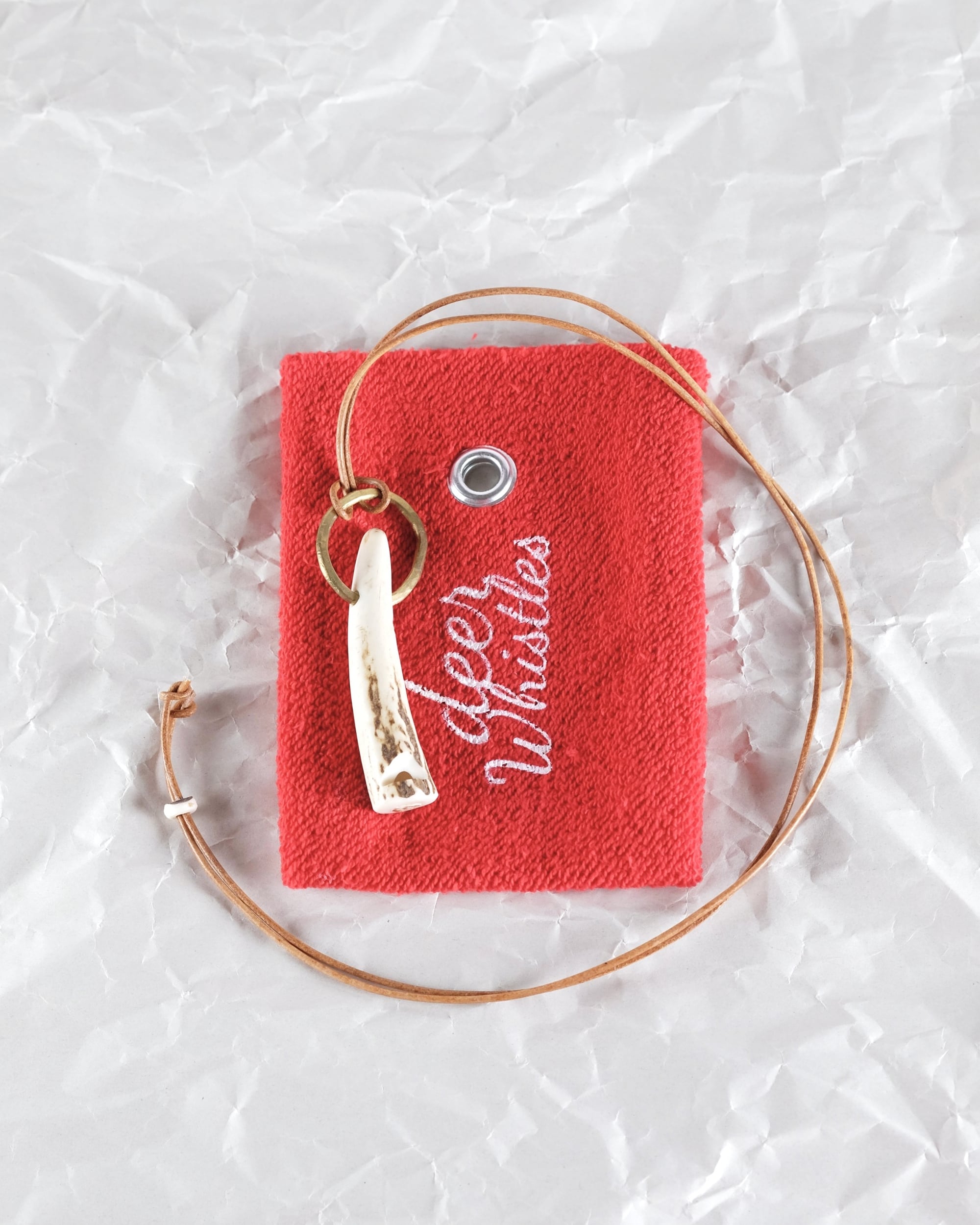 無骨ながらも暖かみのある deer whistles はひとつひとつ形や音に個性があり、機能を持ったお守りとして作られました。素材は北海道のエゾ鹿の角で出来ています。気持ちよくシェイプされているので口に当てた時に不思議としっくりきます。真鍮無垢の金具も職人の手仕事によるもの。