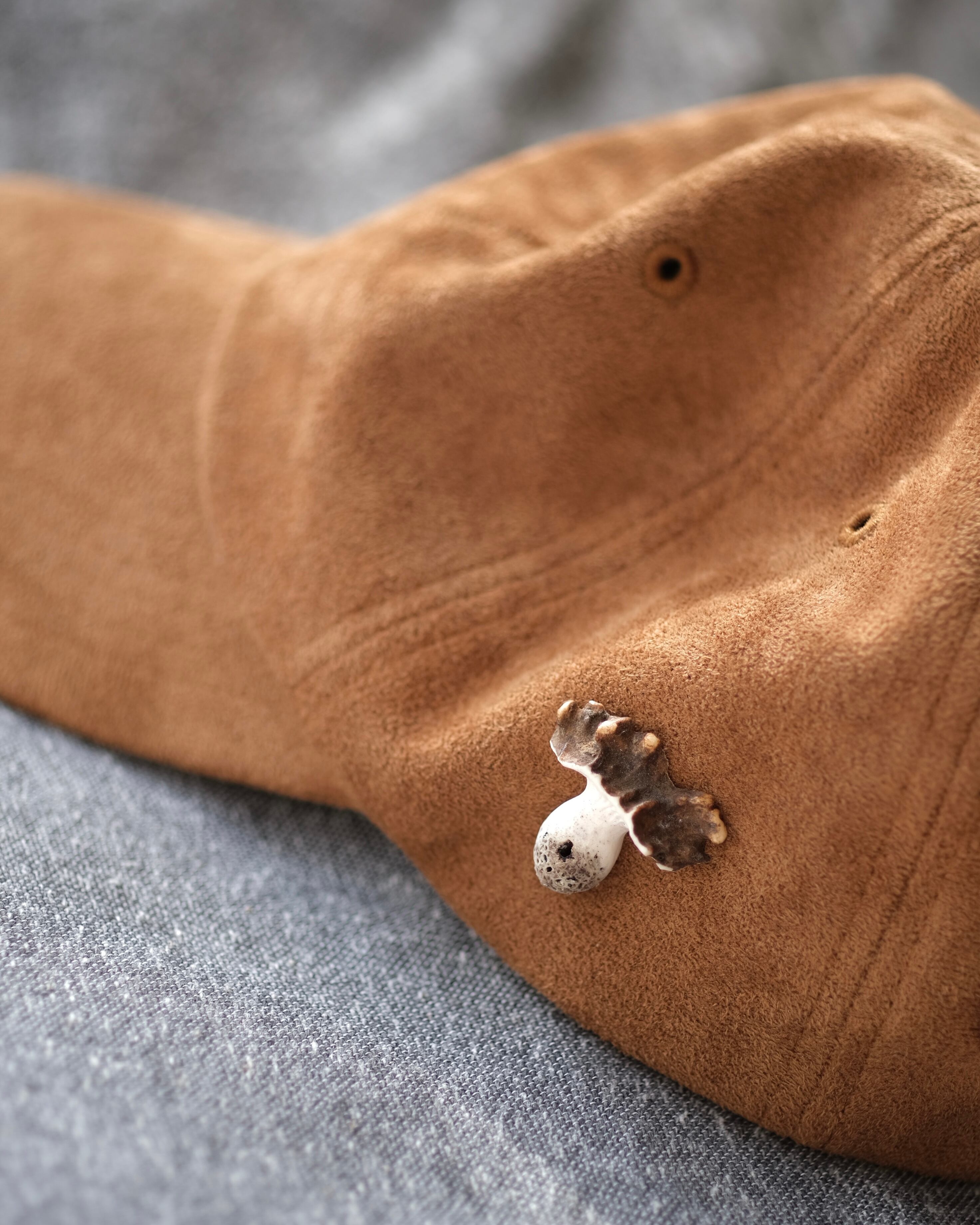 傘のディティールは鹿角の天然の模様を活かしており、妙にリアルな造形となっています。服でもリュックでも、帽子でも何処にでもチューン!