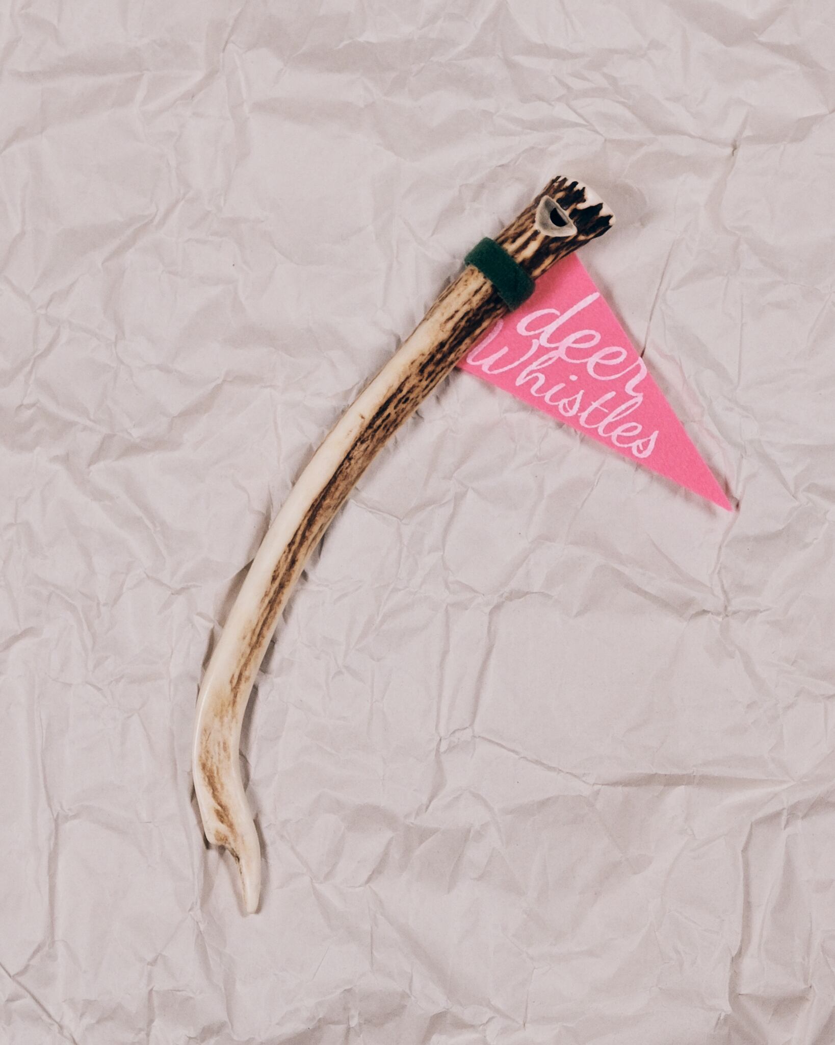 無骨ながらも暖かみのある deer whistles はひとつひとつ形や音に個性があり、機能を持ったお守りとして作られました。素材は北海道のエゾ鹿の角で出来ています。気持ちよくシェイプされているので口に当てた時に不思議としっくりきます。吹けば「ピーッ」と大きく鳴り響くので、おもちゃとして遊んだりも出来ます。子供に見つかれば、ひと盛り上がりすることでしょう。犬を飼われている方は少し訓練する事で、「犬笛」として愛犬の呼び戻しにも。こちらに関しては大きく邪魔ですが(笑)