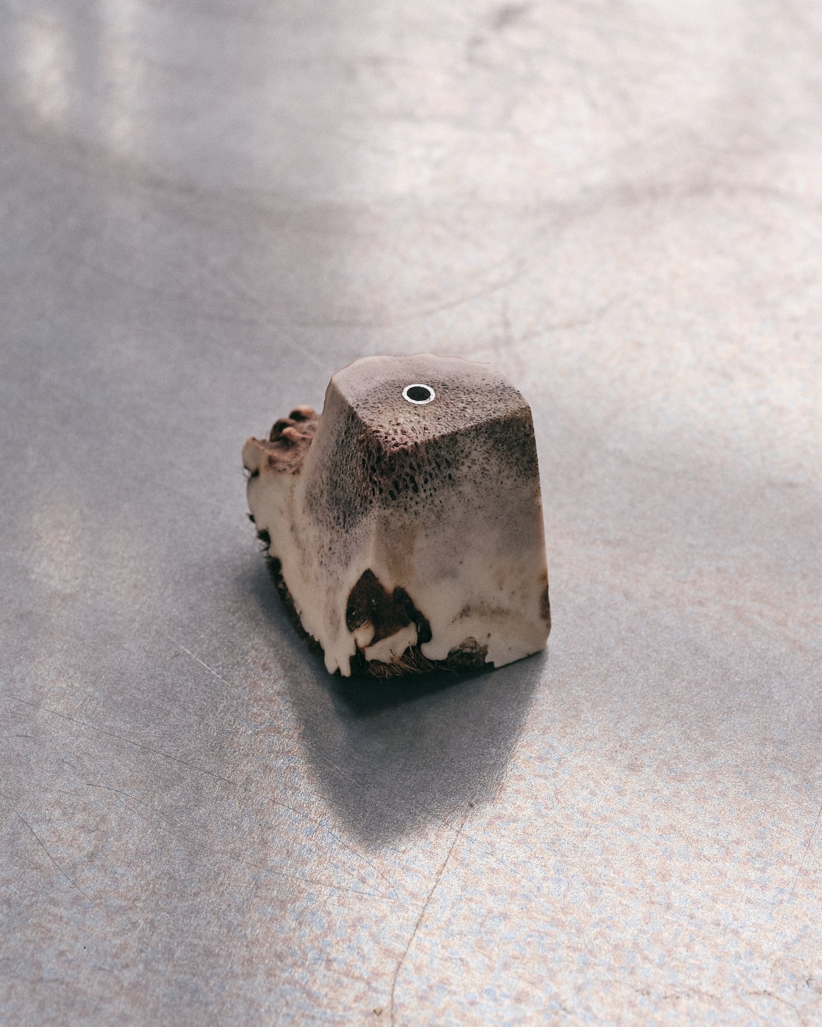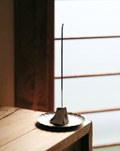 5面フラットにカットし、普段見ることのない内部のテクスチャーを表面化しました。お香を刺す穴にはアルミパイプを短く埋め込んでおり最大内径3mmまでの太さのお香をロスが少なくご使用できます。