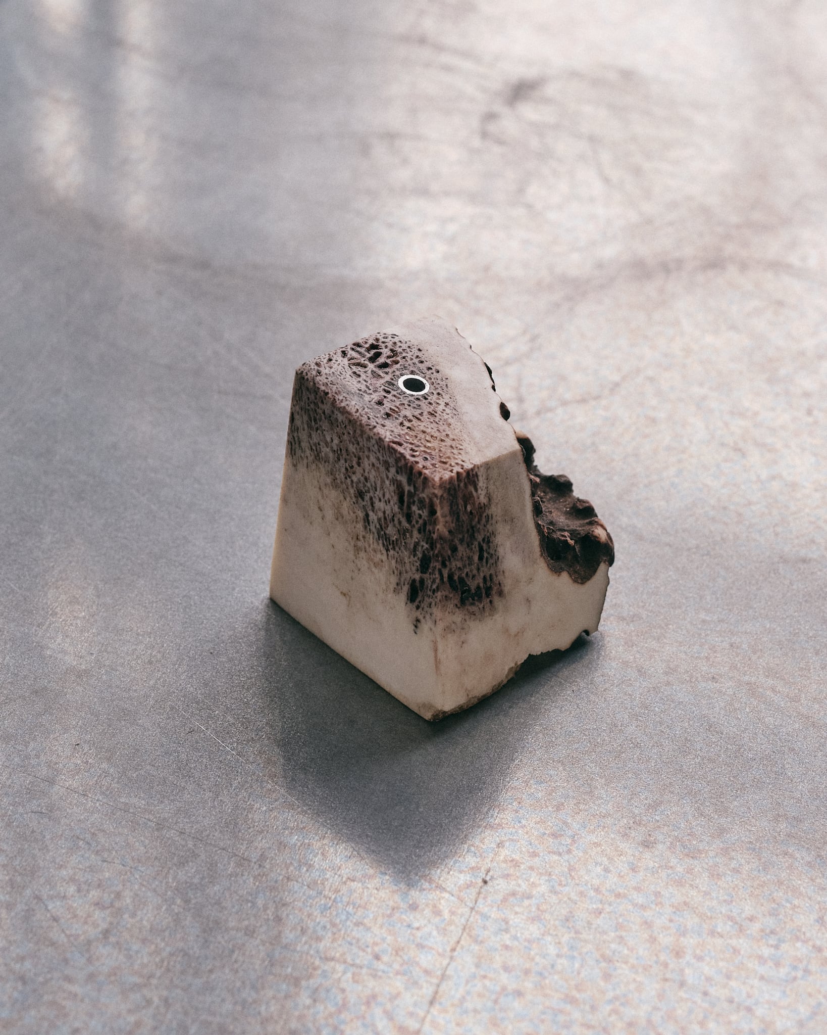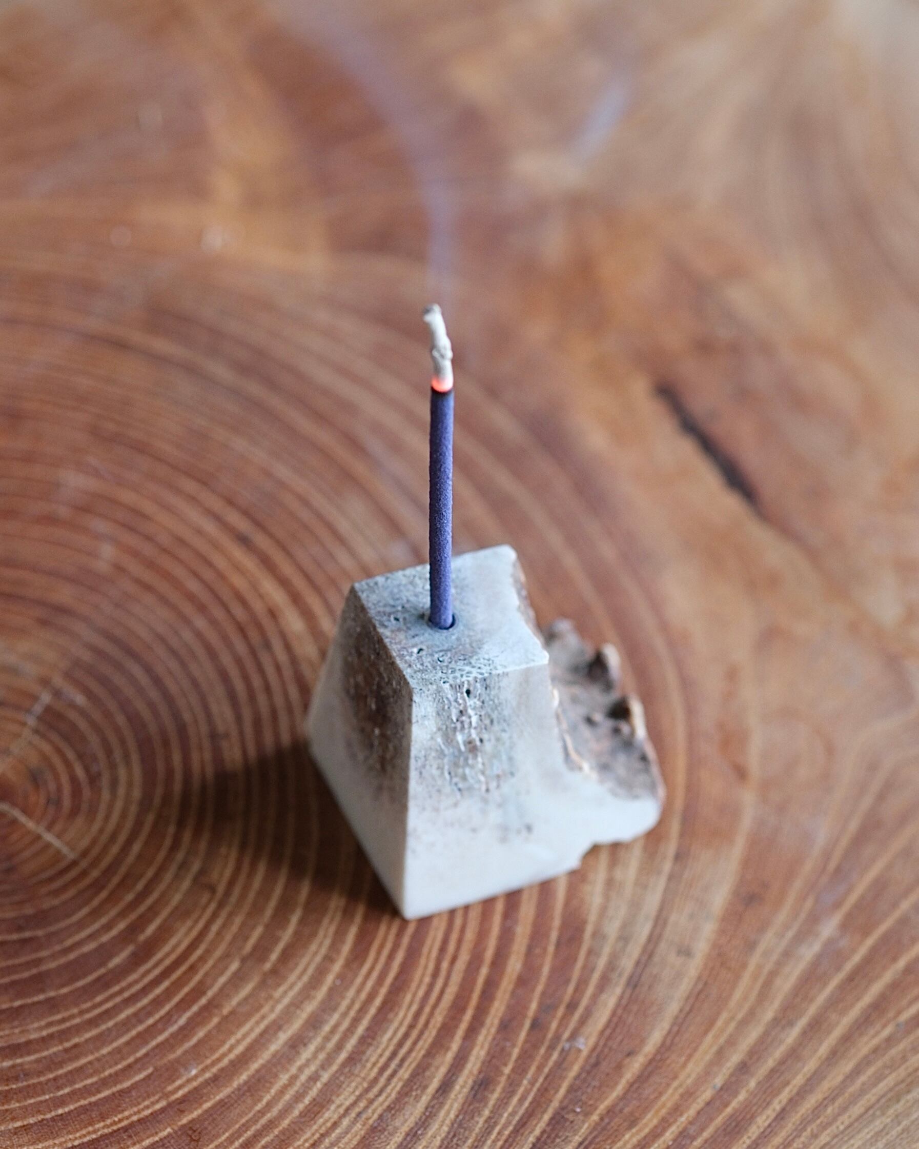 5面フラットにカットし、普段見ることのない内部のテクスチャーを表面化しました。お香を刺す穴にはアルミパイプを短く埋め込んでおり最大内径3mmまでの太さのお香をロスが少なくご使用できます。