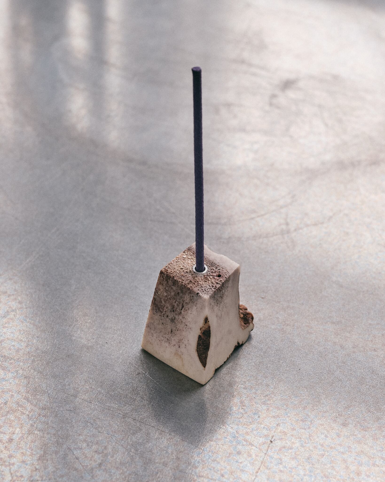 5面フラットにカットし、普段見ることのない内部のテクスチャーを表面化しました。お香を刺す穴にはアルミパイプを短く埋め込んでおり最大内径3mmまでの太さのお香をロスが少なくご使用できます。