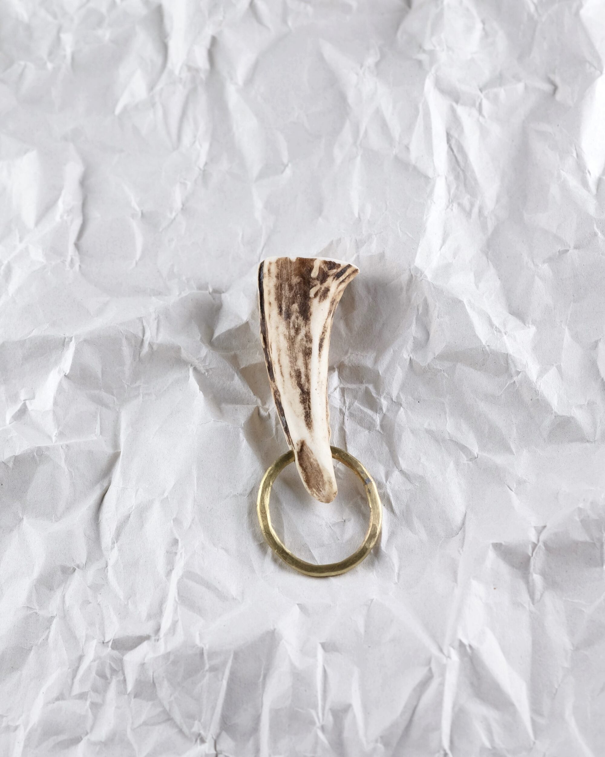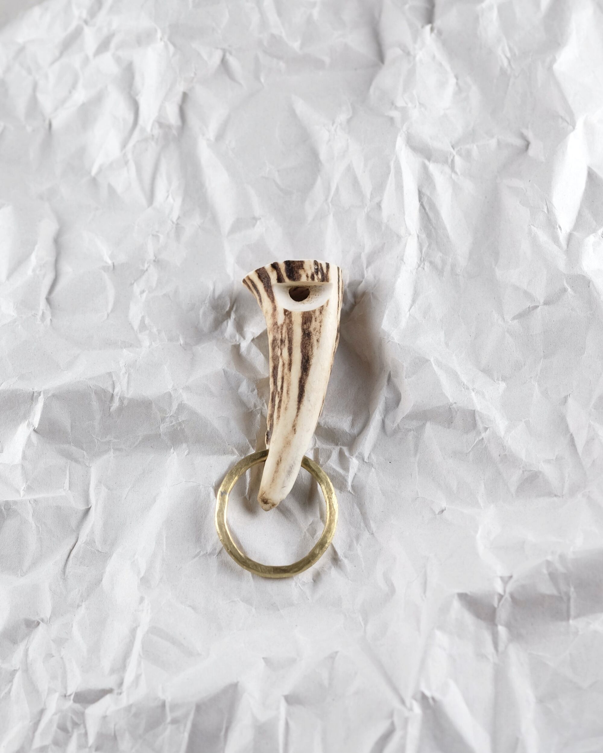 無骨ながらも暖かみのある deer whistles はひとつひとつ形や音に個性があり、機能を持ったお守りとして作られました。素材は北海道のエゾ鹿の角で出来ています。気持ちよくシェイプされているので口に当てた時に不思議としっくりきます。真鍮無垢の金具も職人の手仕事によるもの。