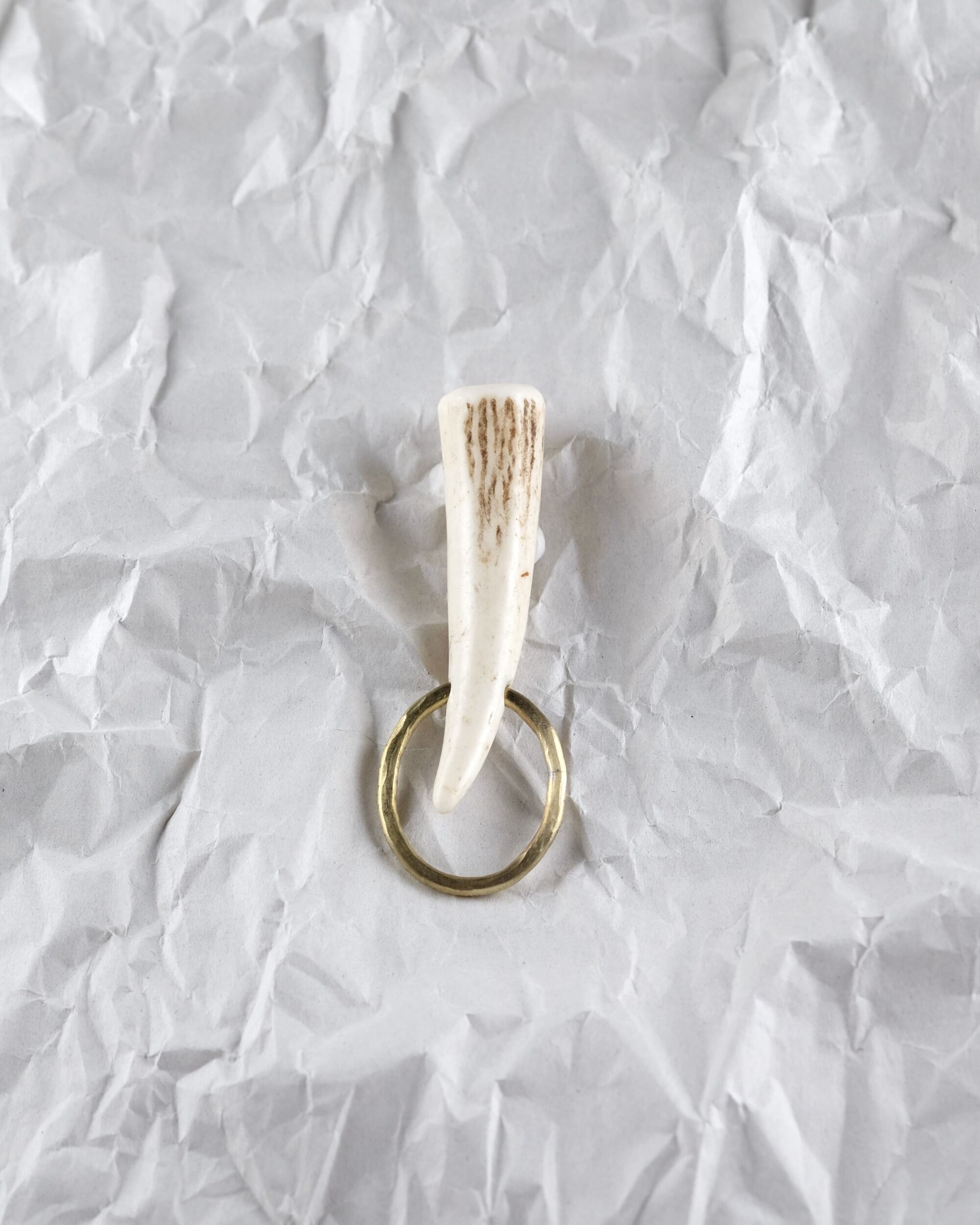 無骨ながらも暖かみのある deer whistles はひとつひとつ形や音に個性があり、機能を持ったお守りとして作られました。素材は北海道のエゾ鹿の角で出来ています。気持ちよくシェイプされているので口に当てた時に不思議としっくりきます。真鍮無垢の金具も職人の手仕事によるもの。