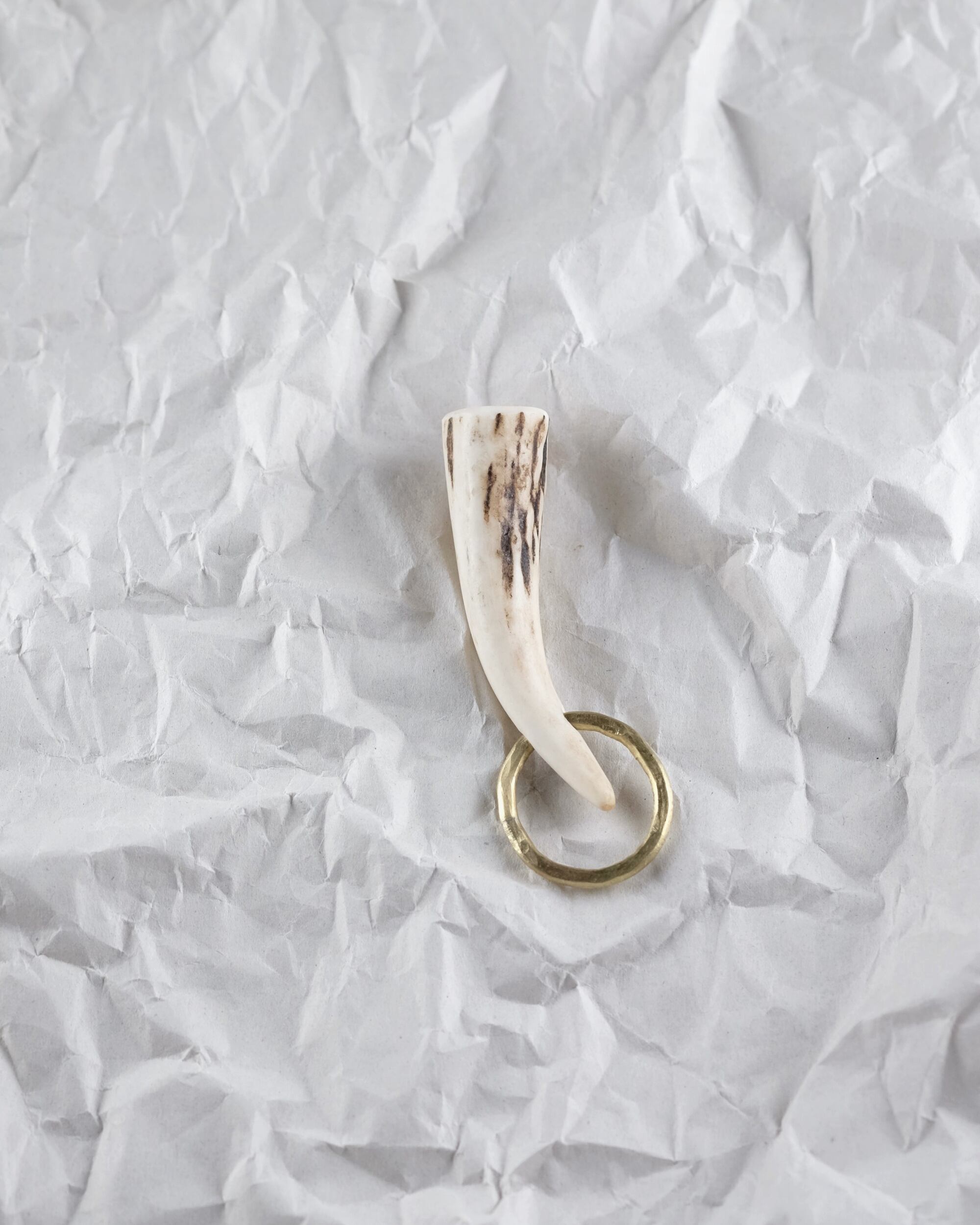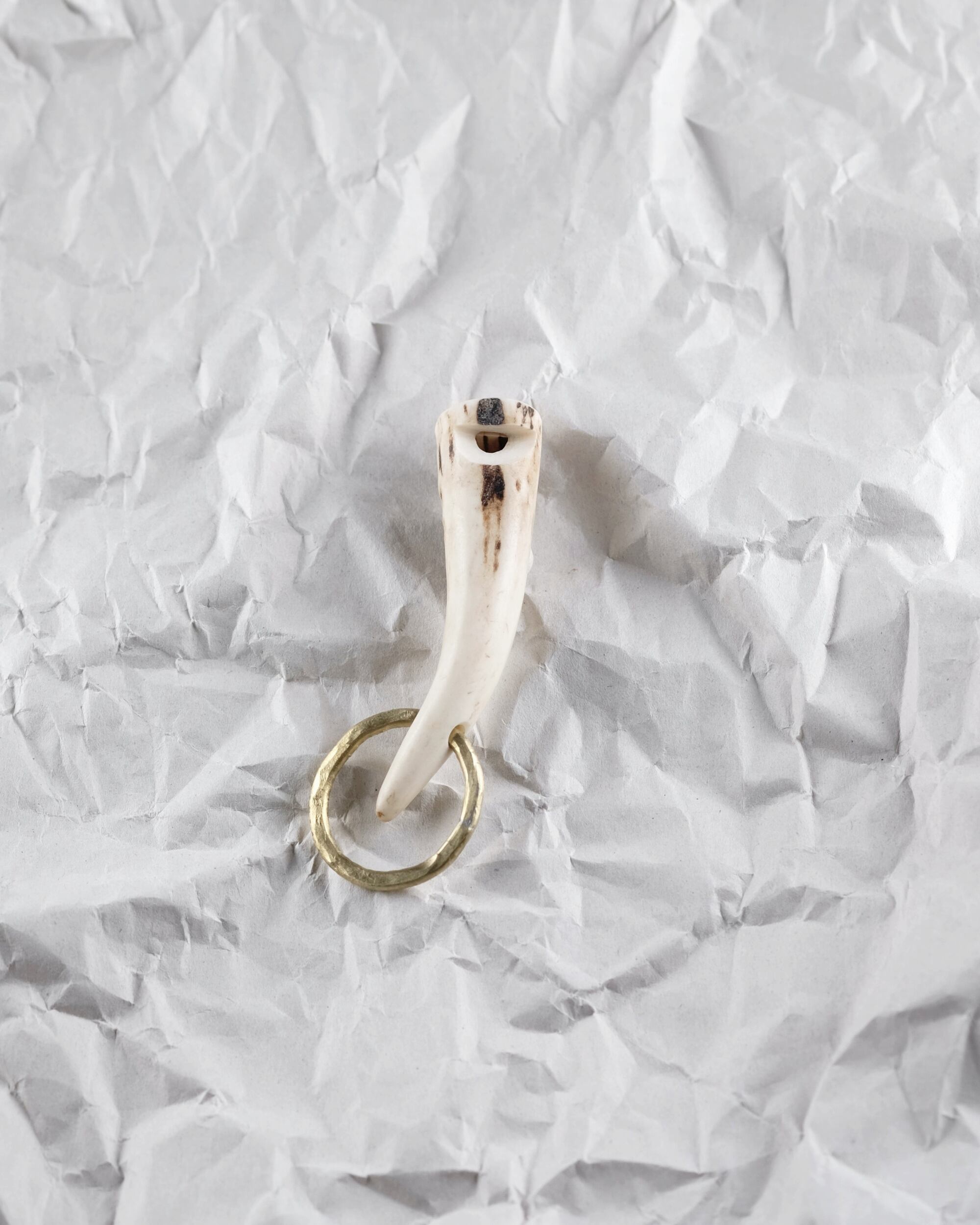 無骨ながらも暖かみのある deer whistles はひとつひとつ形や音に個性があり、機能を持ったお守りとして作られました。素材は北海道のエゾ鹿の角で出来ています。気持ちよくシェイプされているので口に当てた時に不思議としっくりきます。真鍮無垢の金具も職人の手仕事によるもの。