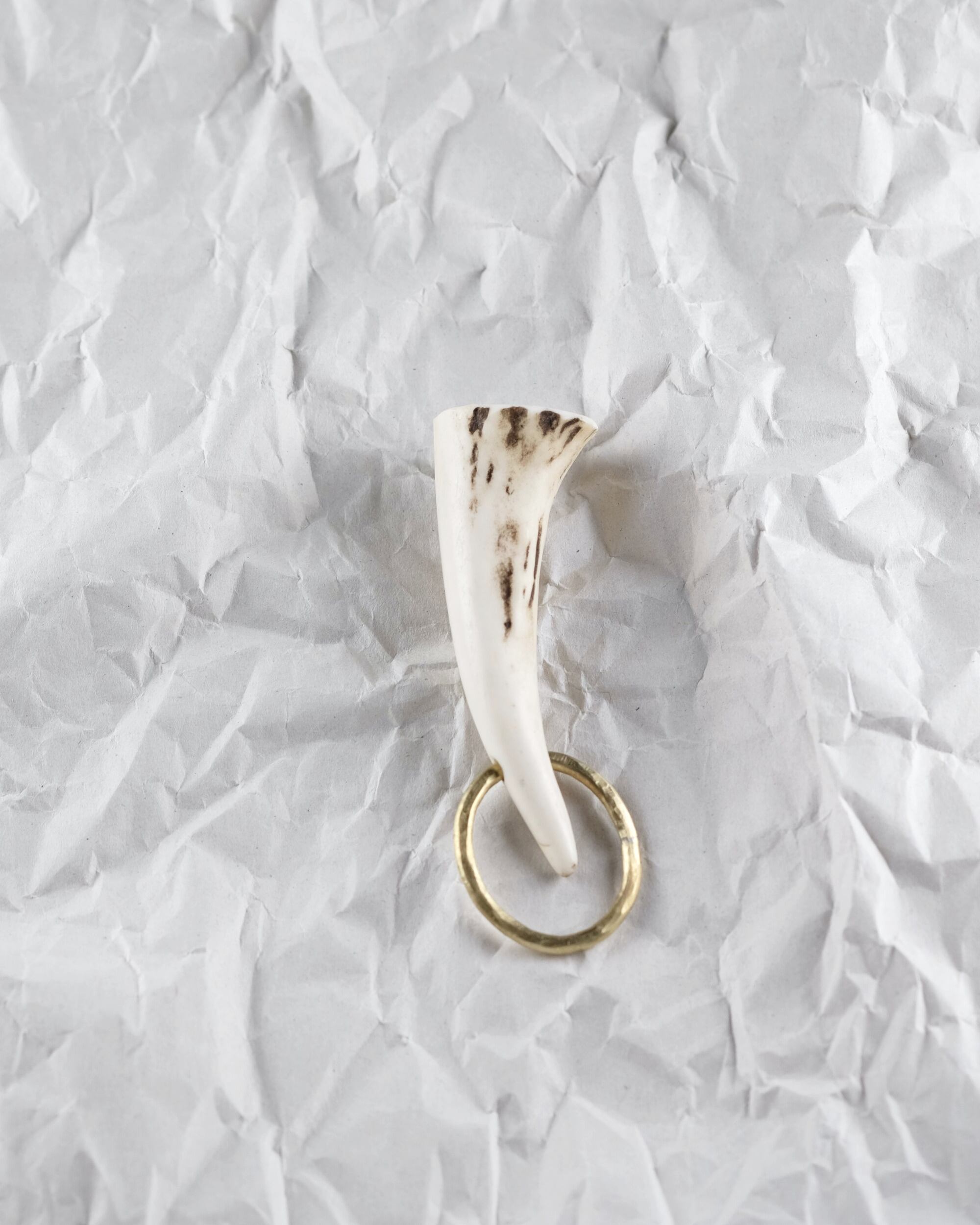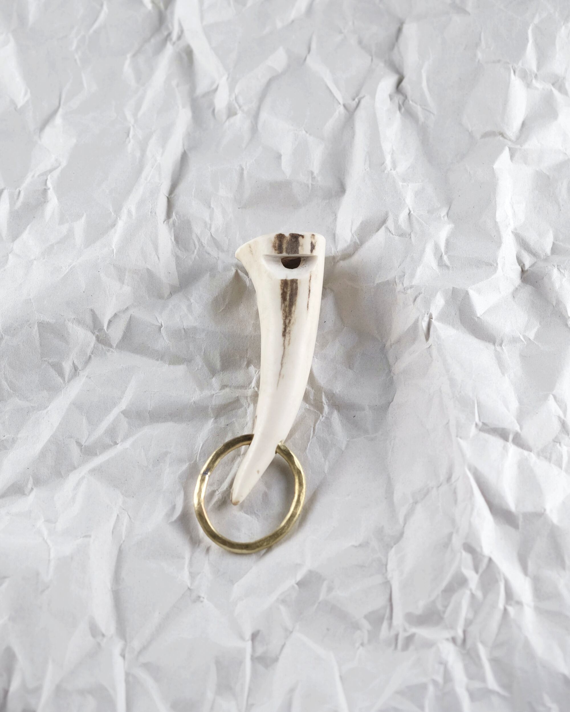 無骨ながらも暖かみのある deer whistles はひとつひとつ形や音に個性があり、機能を持ったお守りとして作られました。素材は北海道のエゾ鹿の角で出来ています。気持ちよくシェイプされているので口に当てた時に不思議としっくりきます。真鍮無垢の金具も職人の手仕事によるもの。
