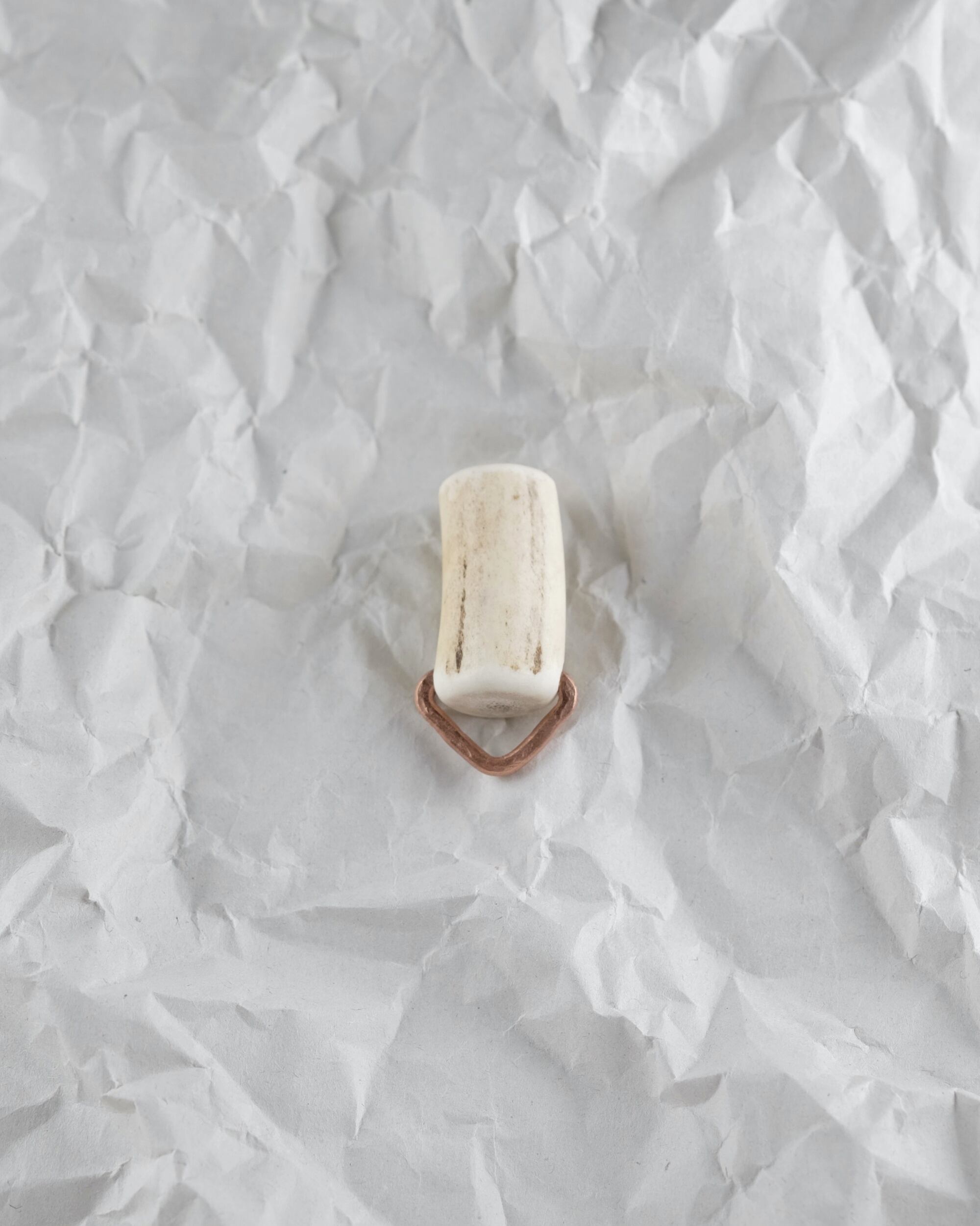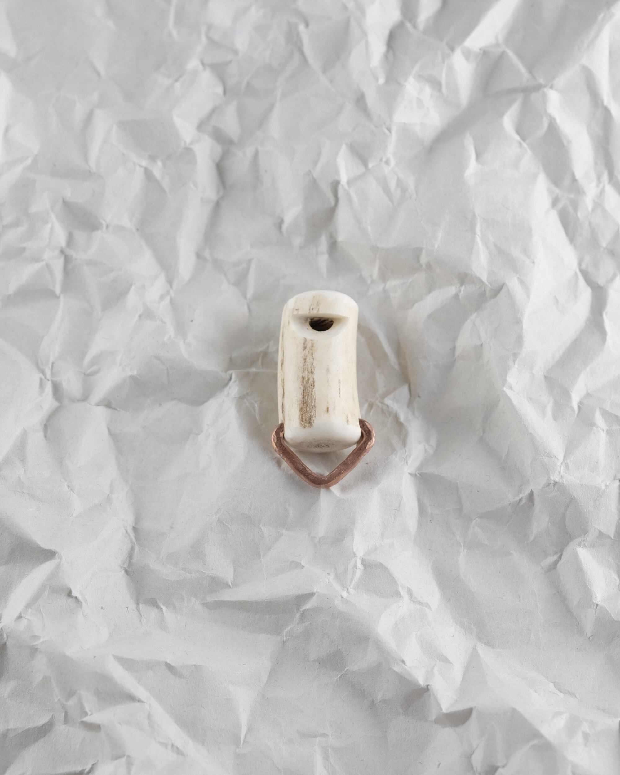 無骨ながらも暖かみのある deer whistles はひとつひとつ形や音に個性があり、機能を持ったお守りとして作られました。素材は北海道のエゾ鹿の角で出来ています。気持ちよくシェイプされているので口に当てた時に不思議としっくりきます。銅無垢の金具も職人の手仕事によるもの。