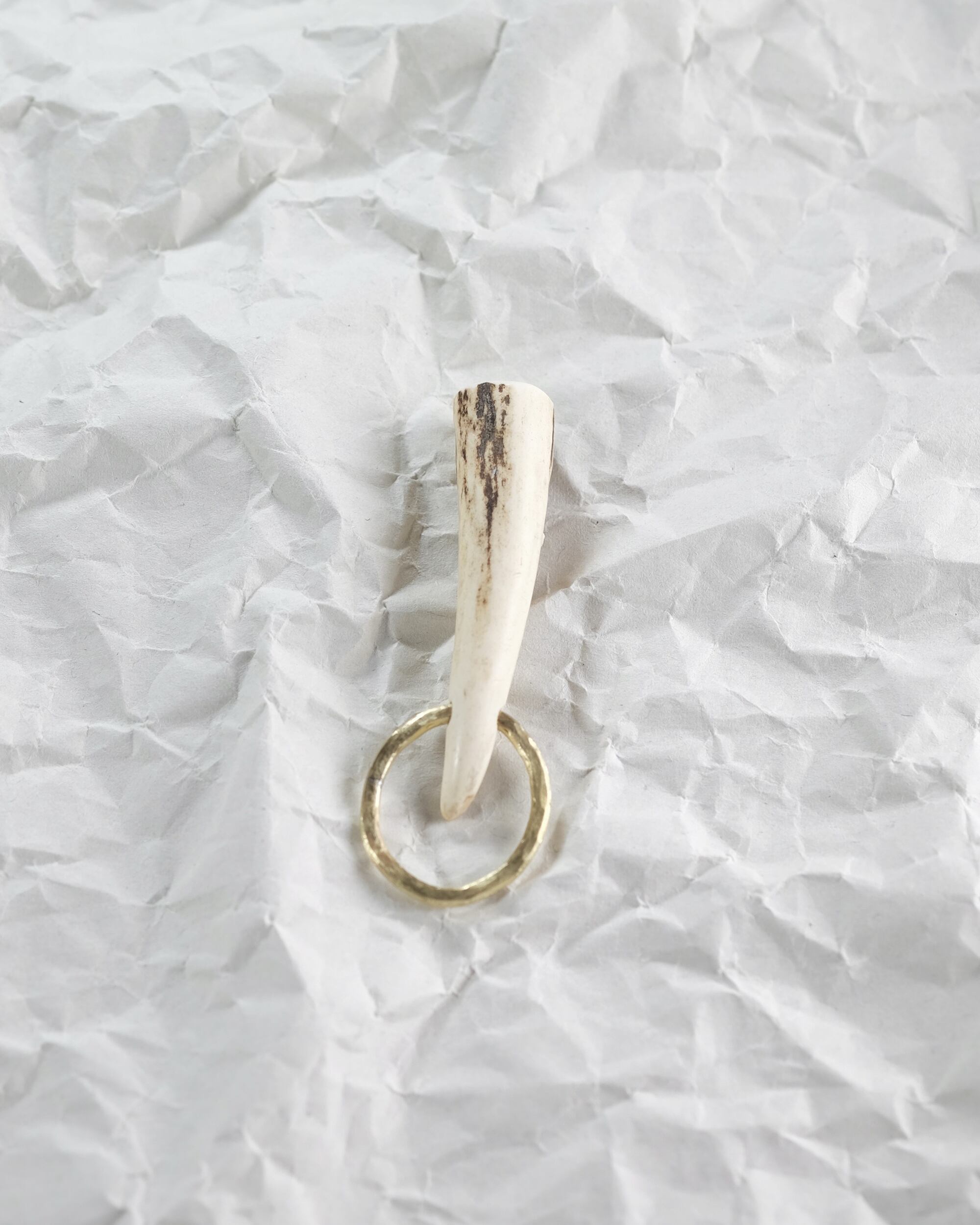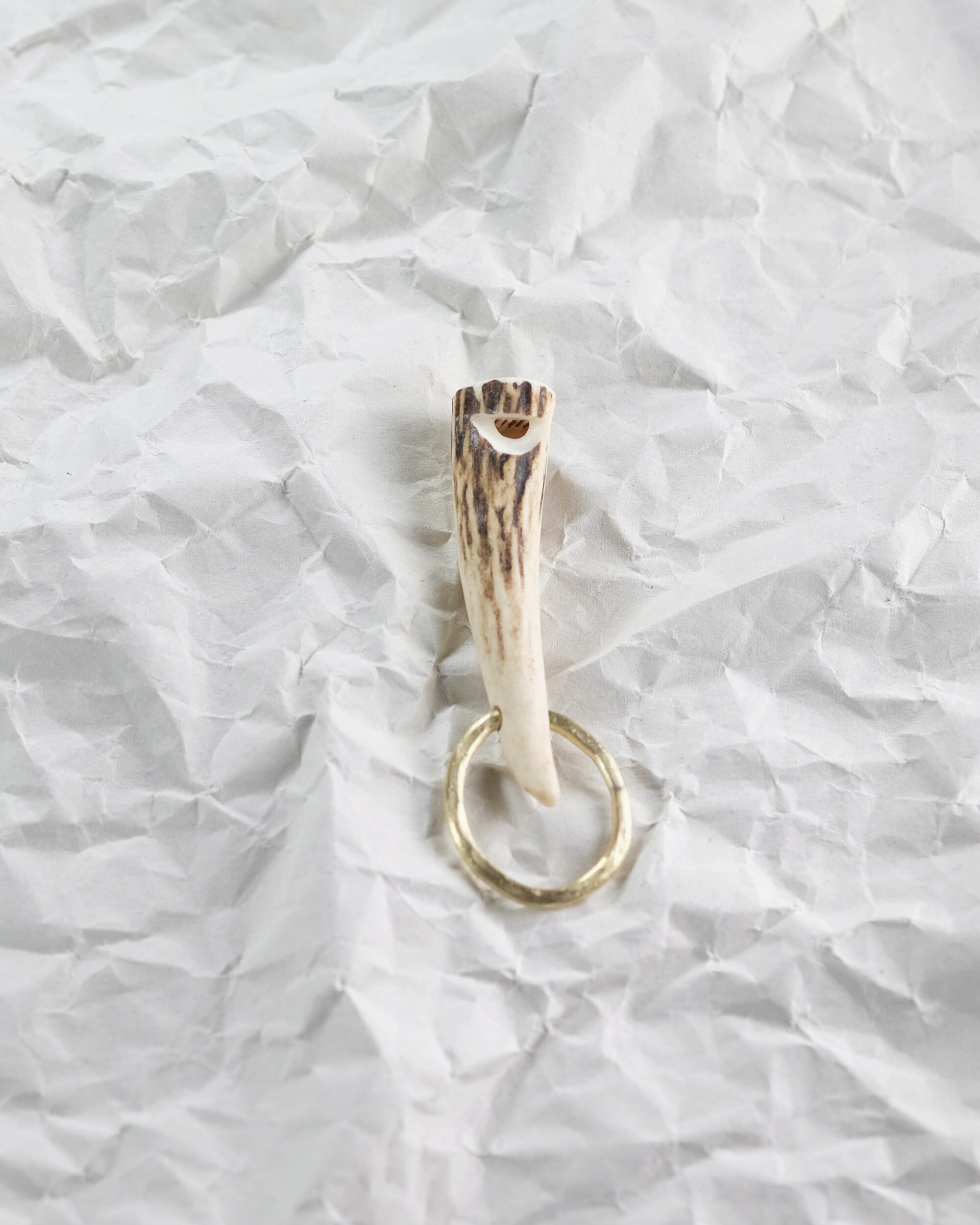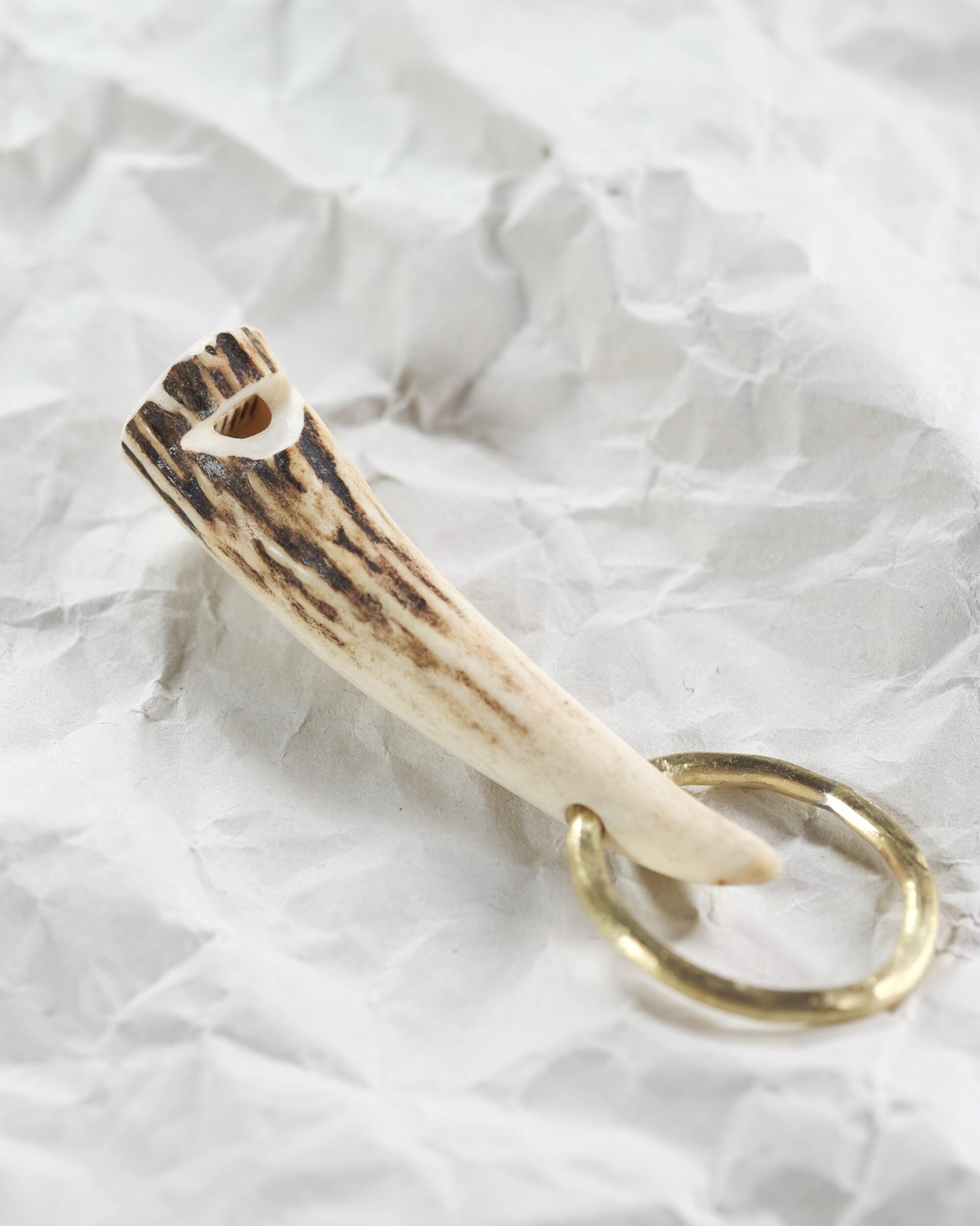 無骨ながらも暖かみのある deer whistles はひとつひとつ形や音に個性があり、機能を持ったお守りとして作られました。素材は北海道のエゾ鹿の角で出来ています。気持ちよくシェイプされているので口に当てた時に不思議としっくりきます。真鍮無垢の金具も職人の手仕事によるもの。