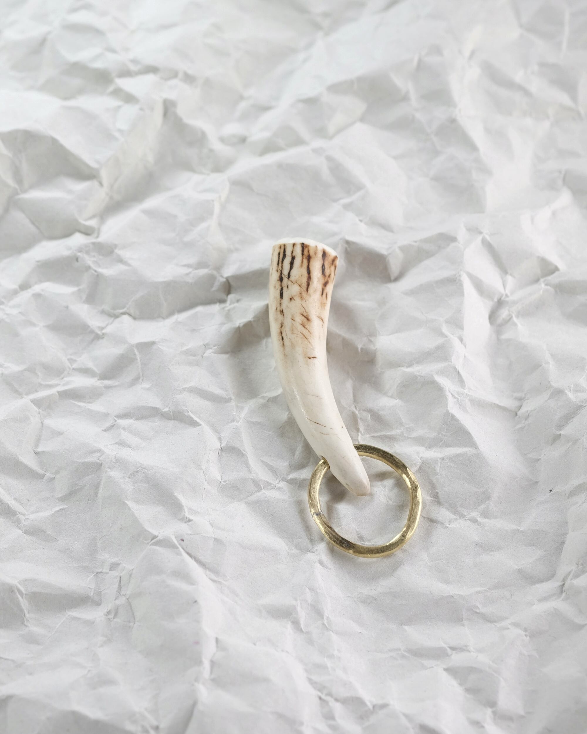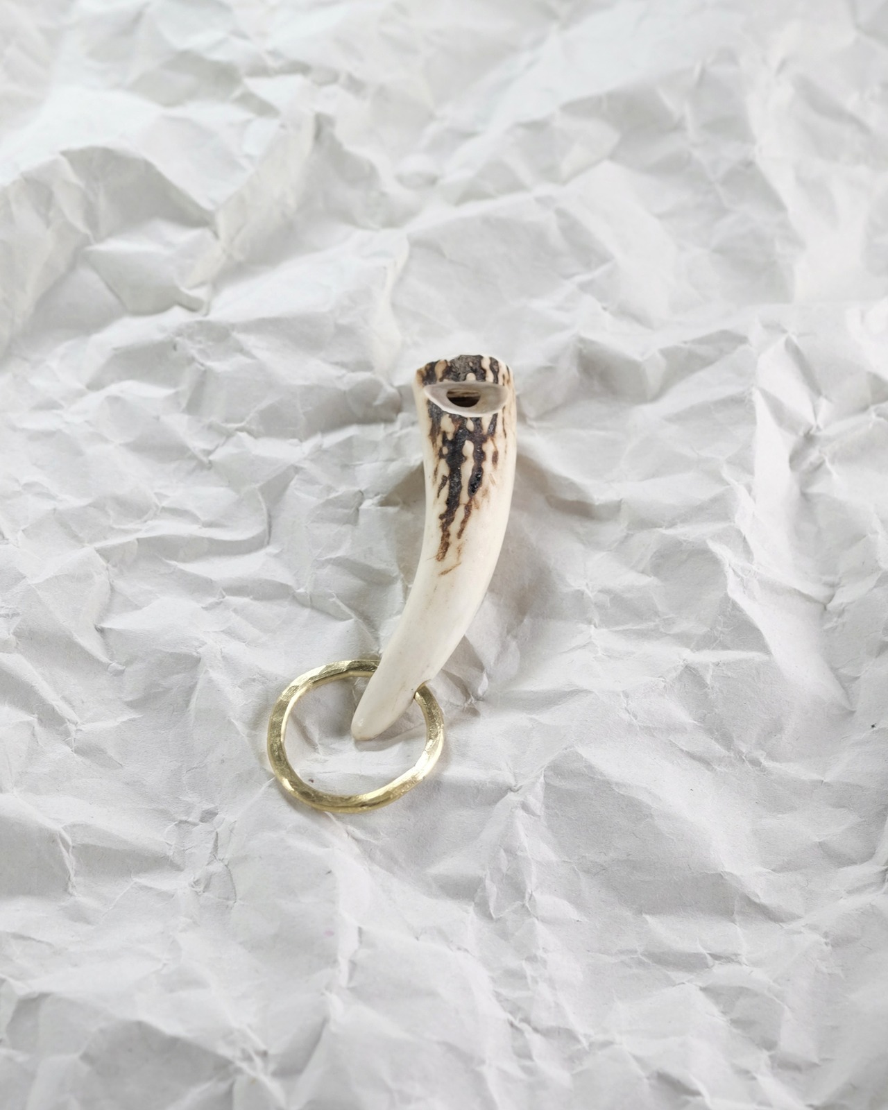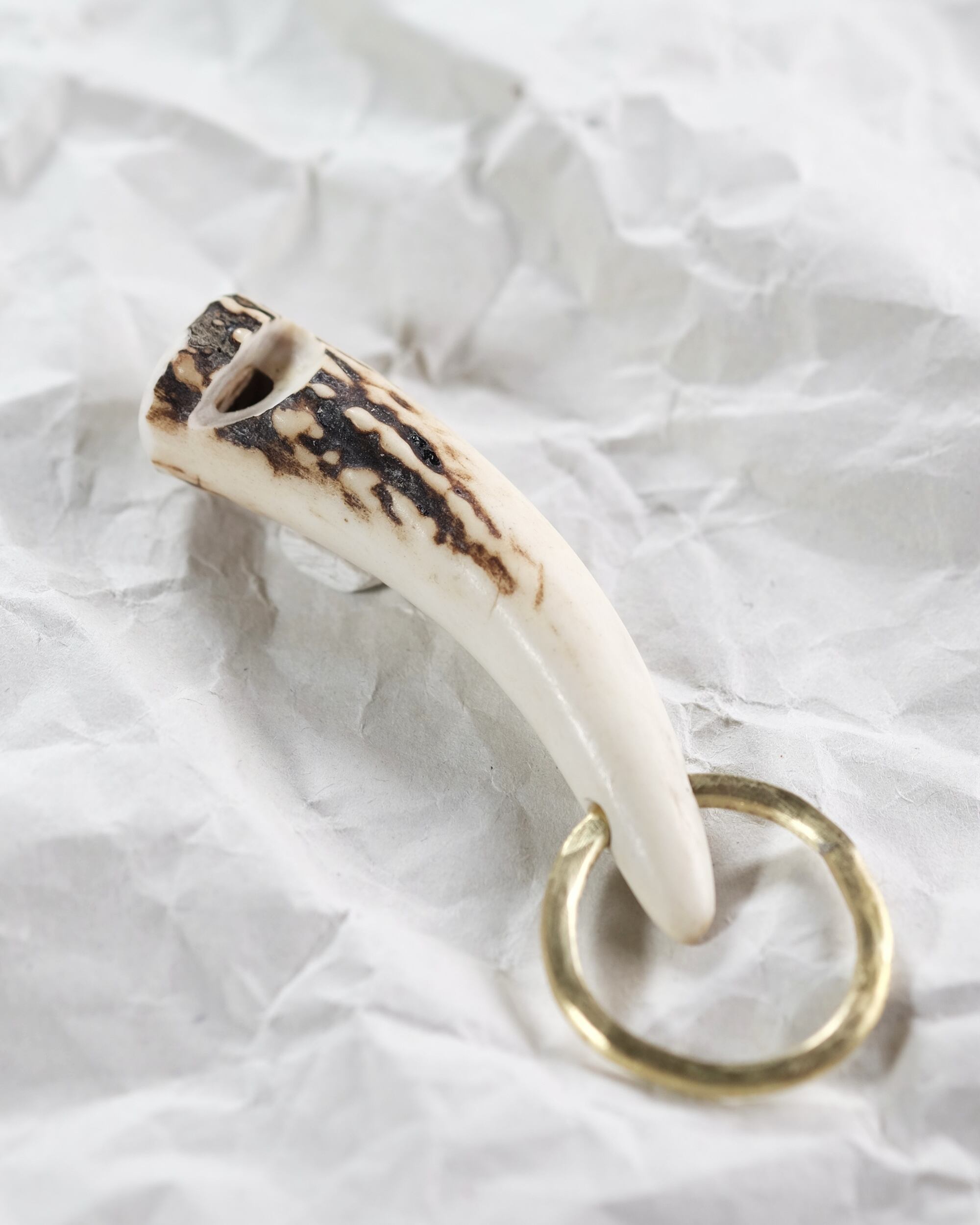 無骨ながらも暖かみのある deer whistles はひとつひとつ形や音に個性があり、機能を持ったお守りとして作られました。素材は北海道のエゾ鹿の角で出来ています。気持ちよくシェイプされているので口に当てた時に不思議としっくりきます。真鍮無垢の金具も職人の手仕事によるもの。