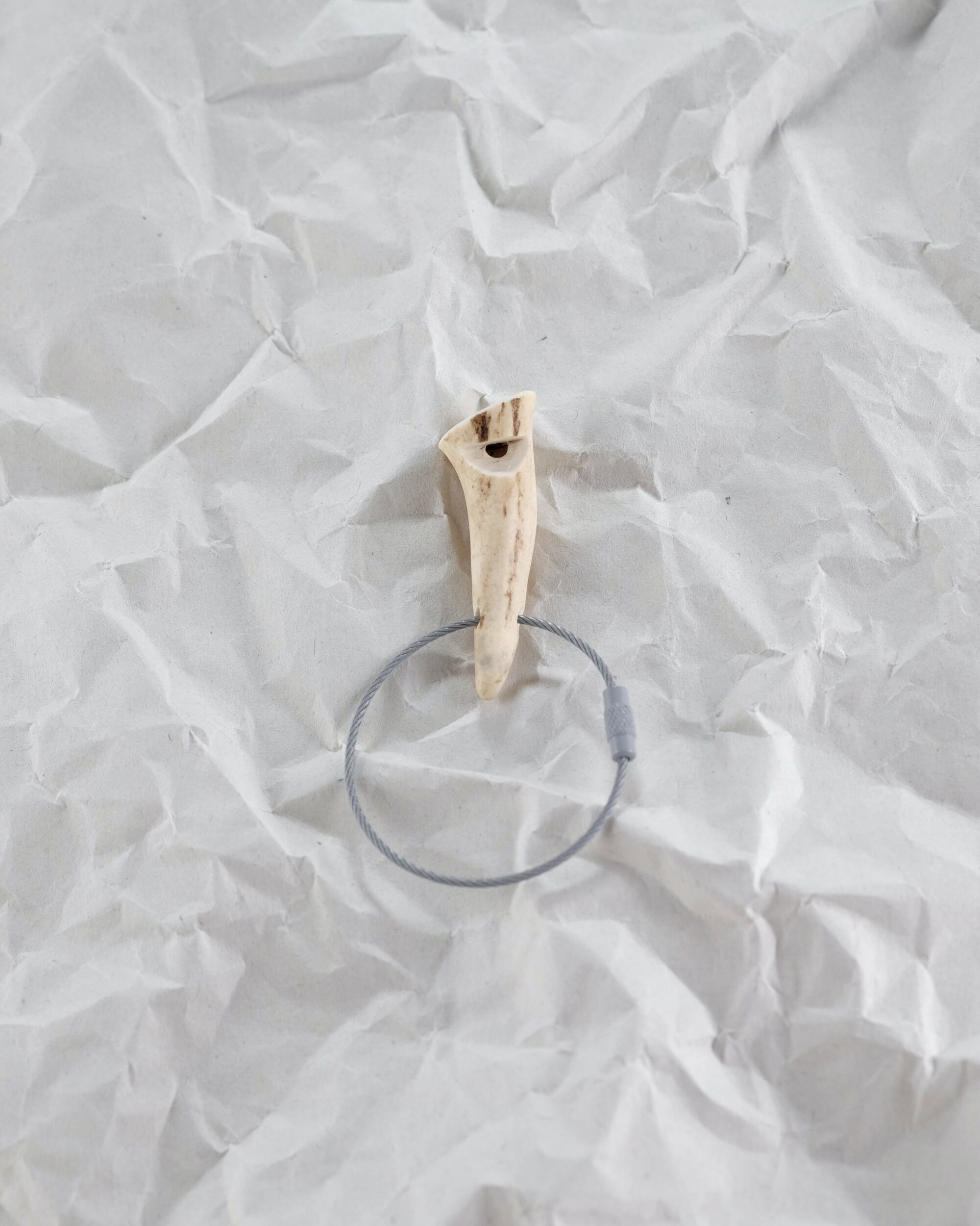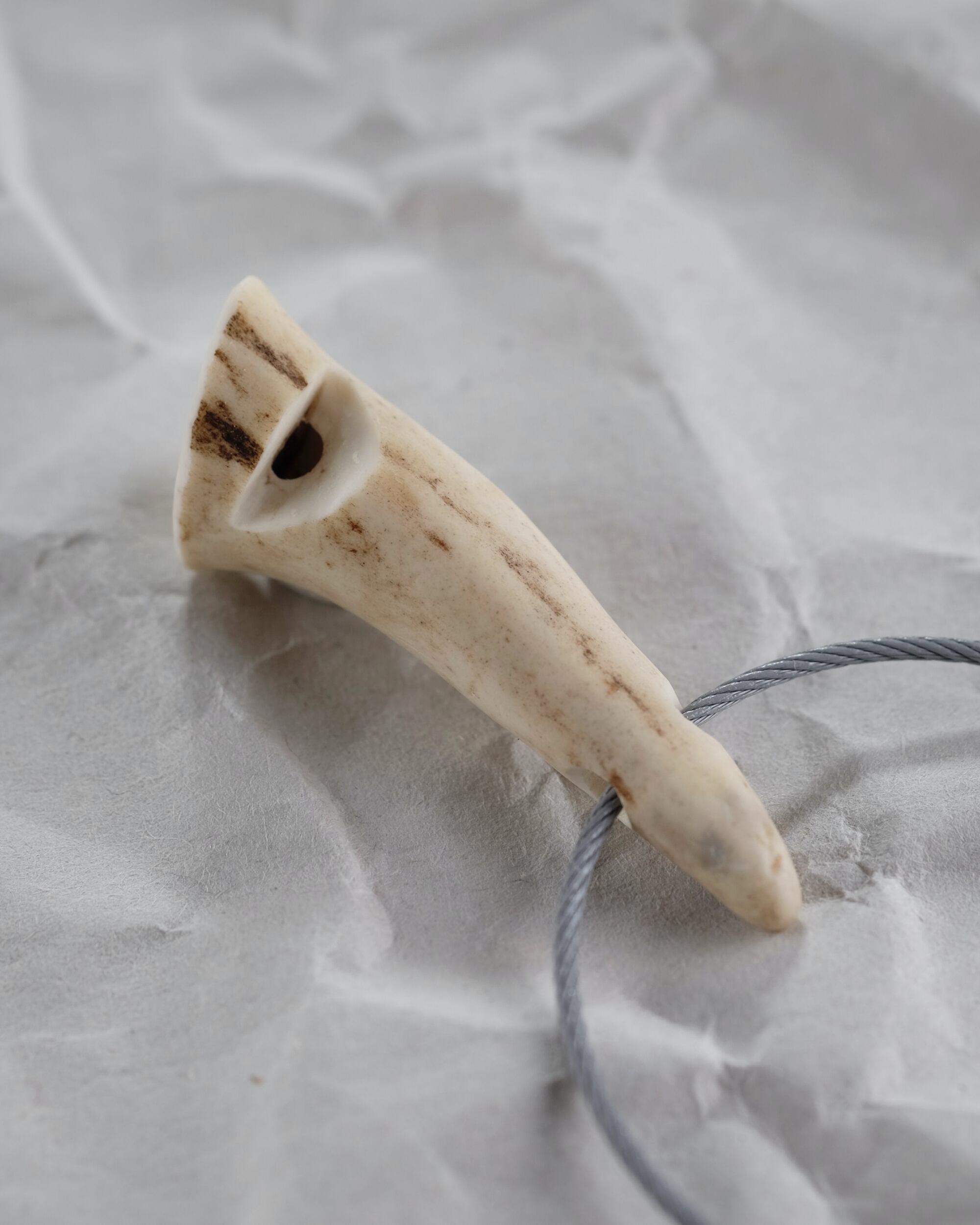 無骨ながらも暖かみのある deer whistles はひとつひとつ形や音に個性があり、機能を持ったお守りとして作られました。素材は北海道のエゾ鹿の角で出来ています。気持ちよくシェイプされているので口に当てた時に不思議としっくりきます。