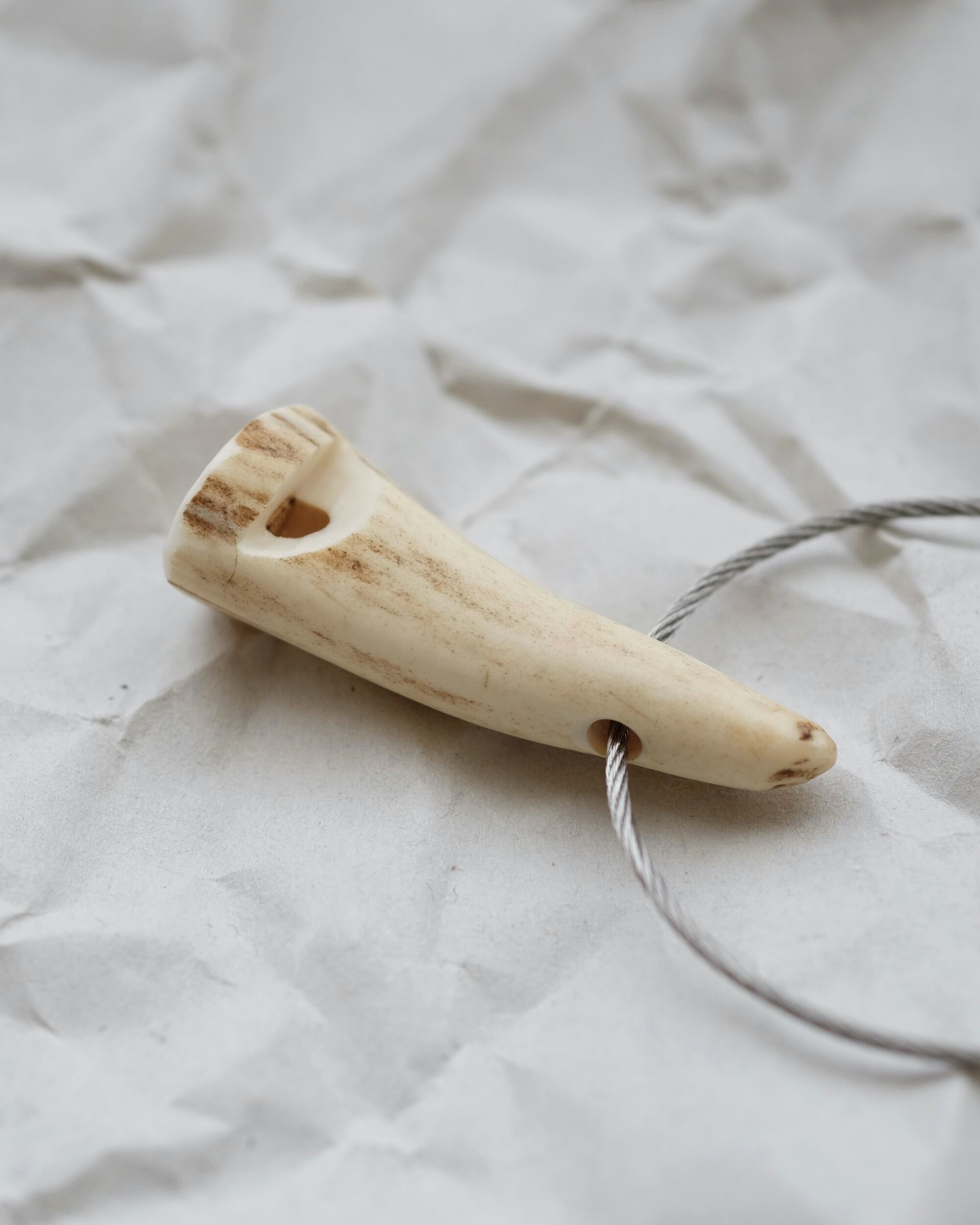 無骨ながらも暖かみのある deer whistles はひとつひとつ形や音に個性があり、機能を持ったお守りとして作られました。素材は北海道のエゾ鹿の角で出来ています。気持ちよくシェイプされているので口に当てた時に不思議としっくりきます。
