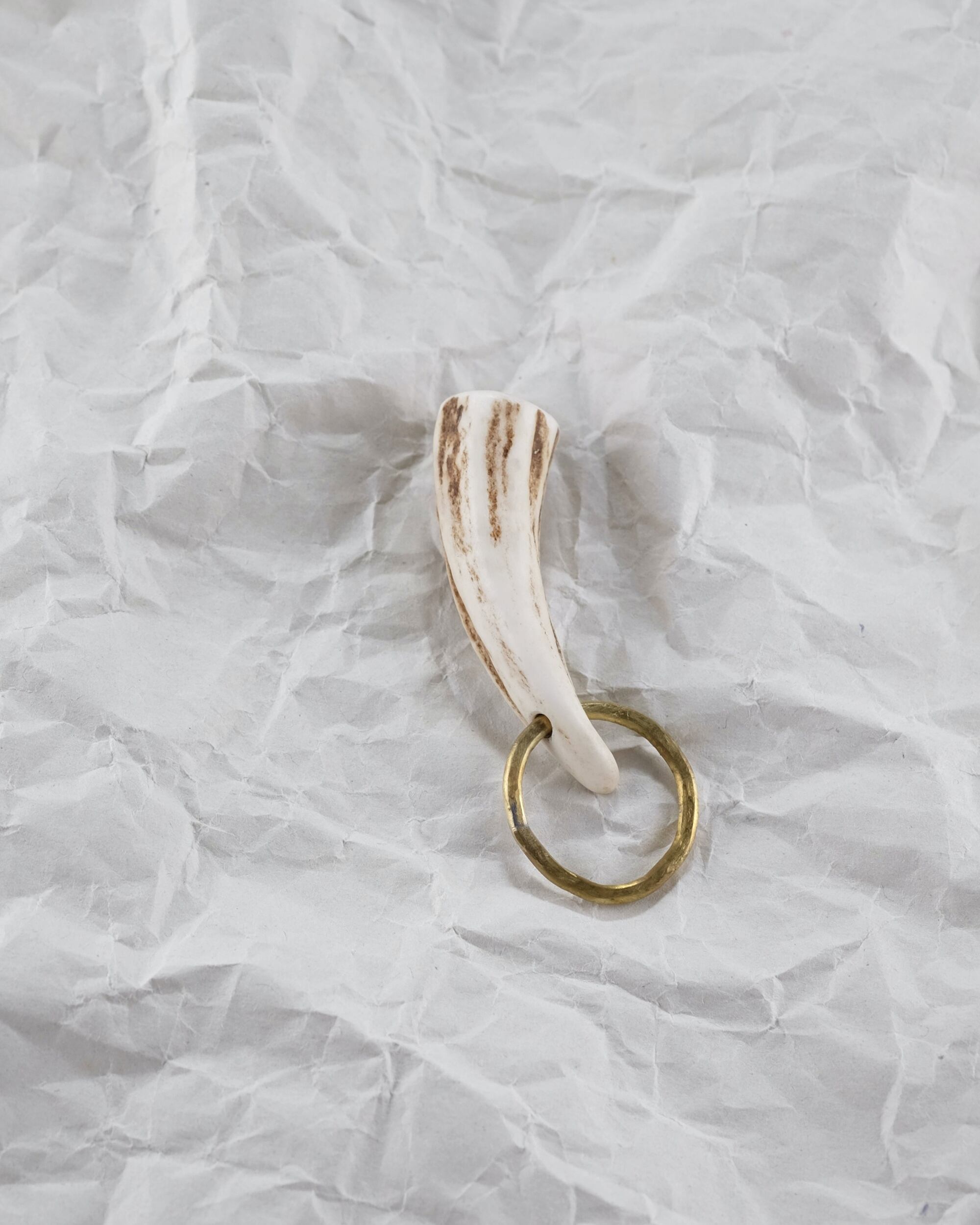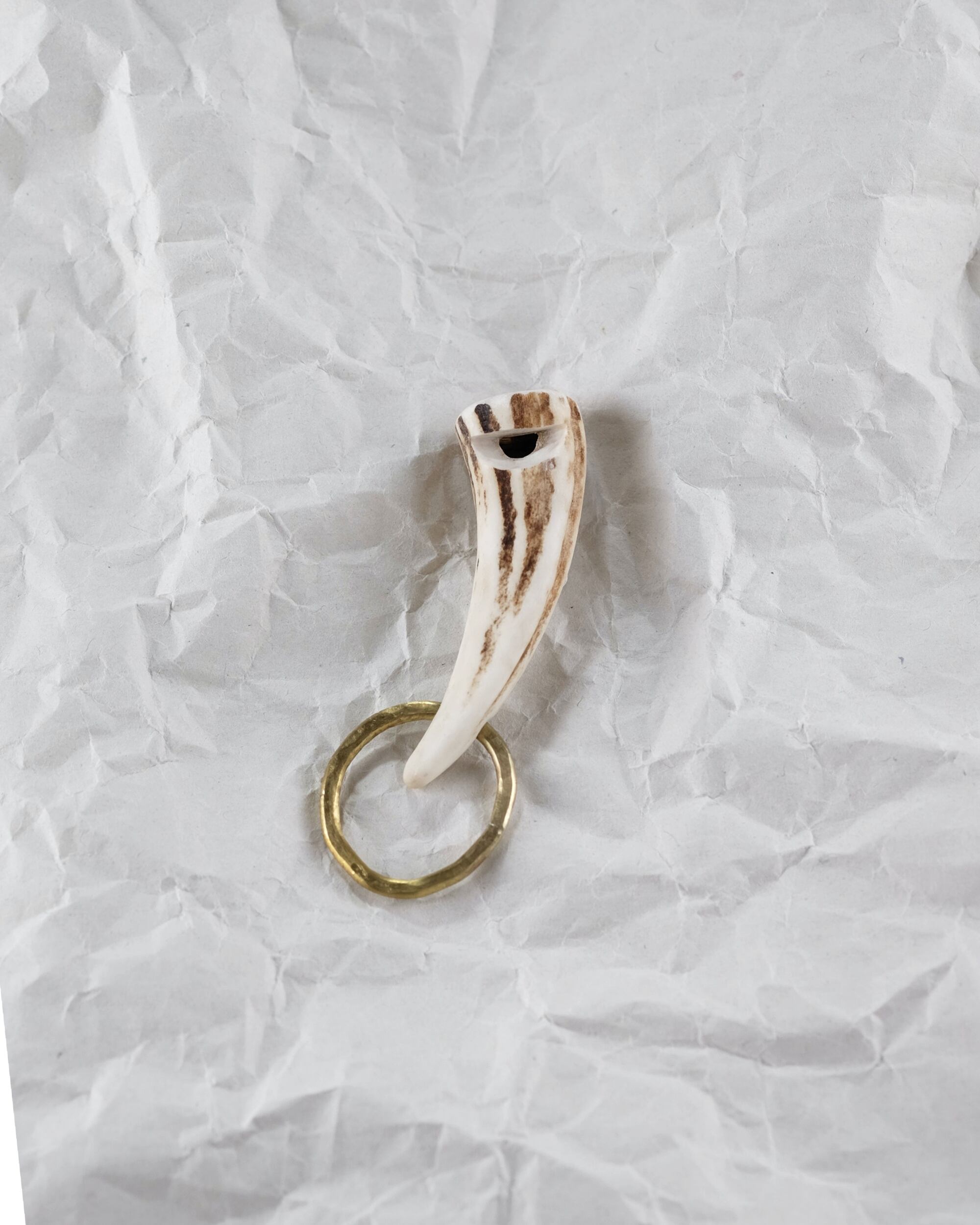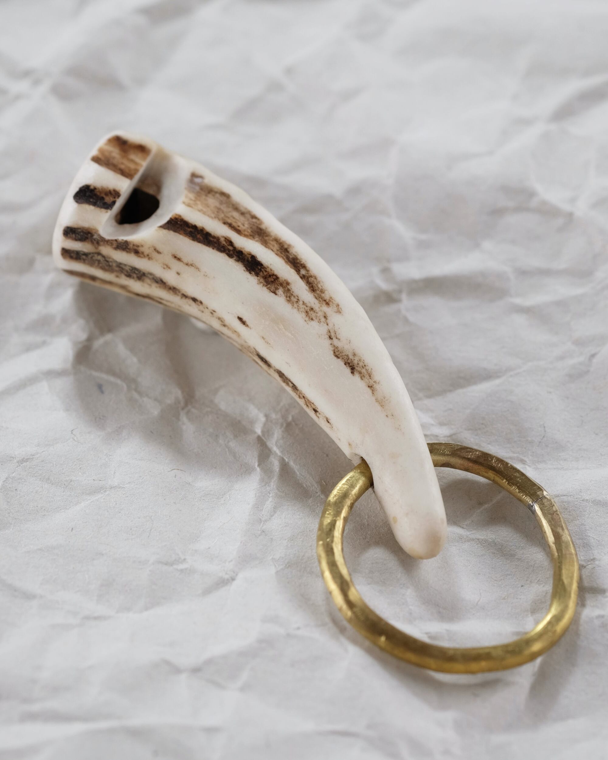 無骨ながらも暖かみのある deer whistles はひとつひとつ形や音に個性があり、機能を持ったお守りとして作られました。素材は北海道のエゾ鹿の角で出来ています。気持ちよくシェイプされているので口に当てた時に不思議としっくりきます。真鍮無垢の金具も職人の手仕事によるもの。
