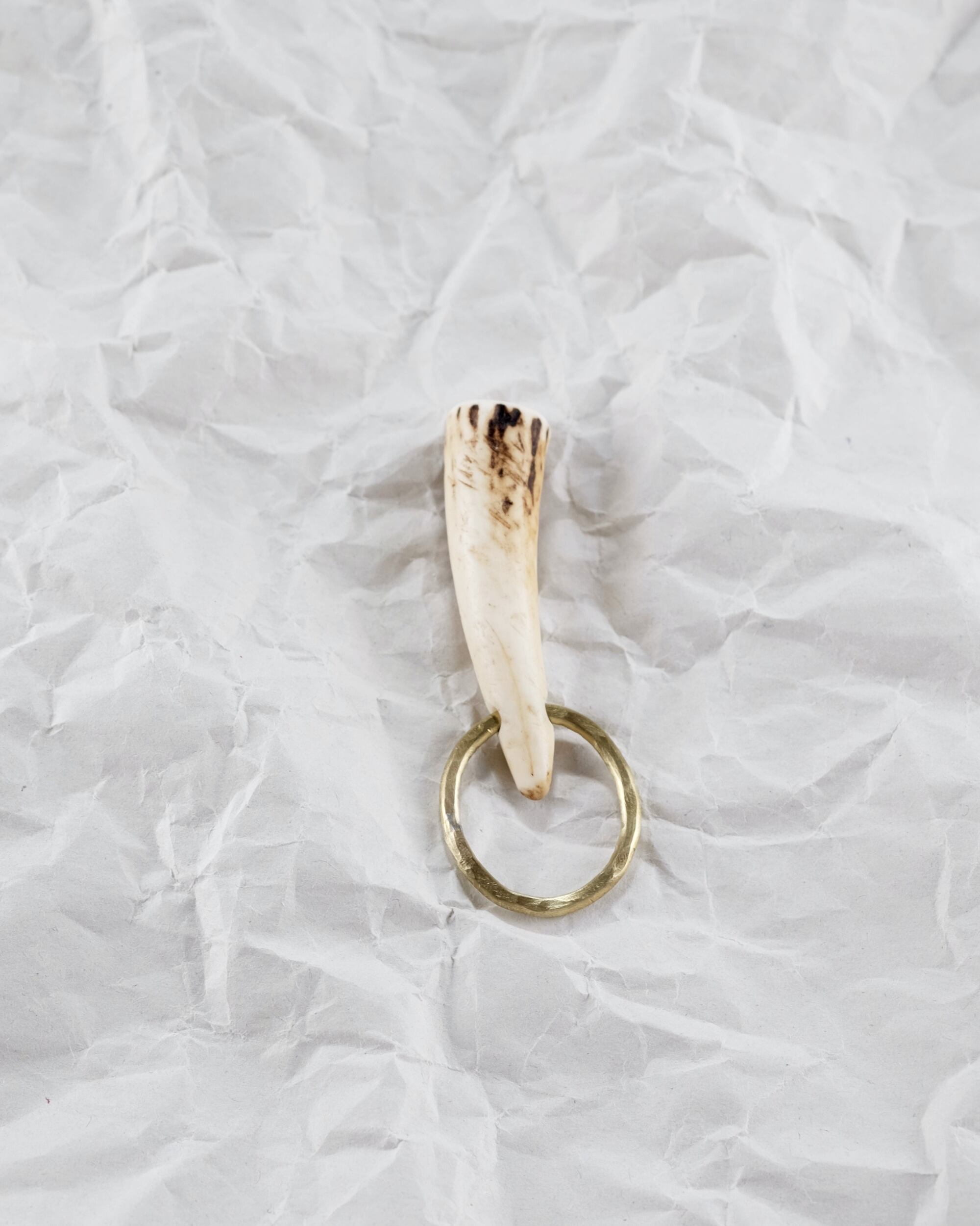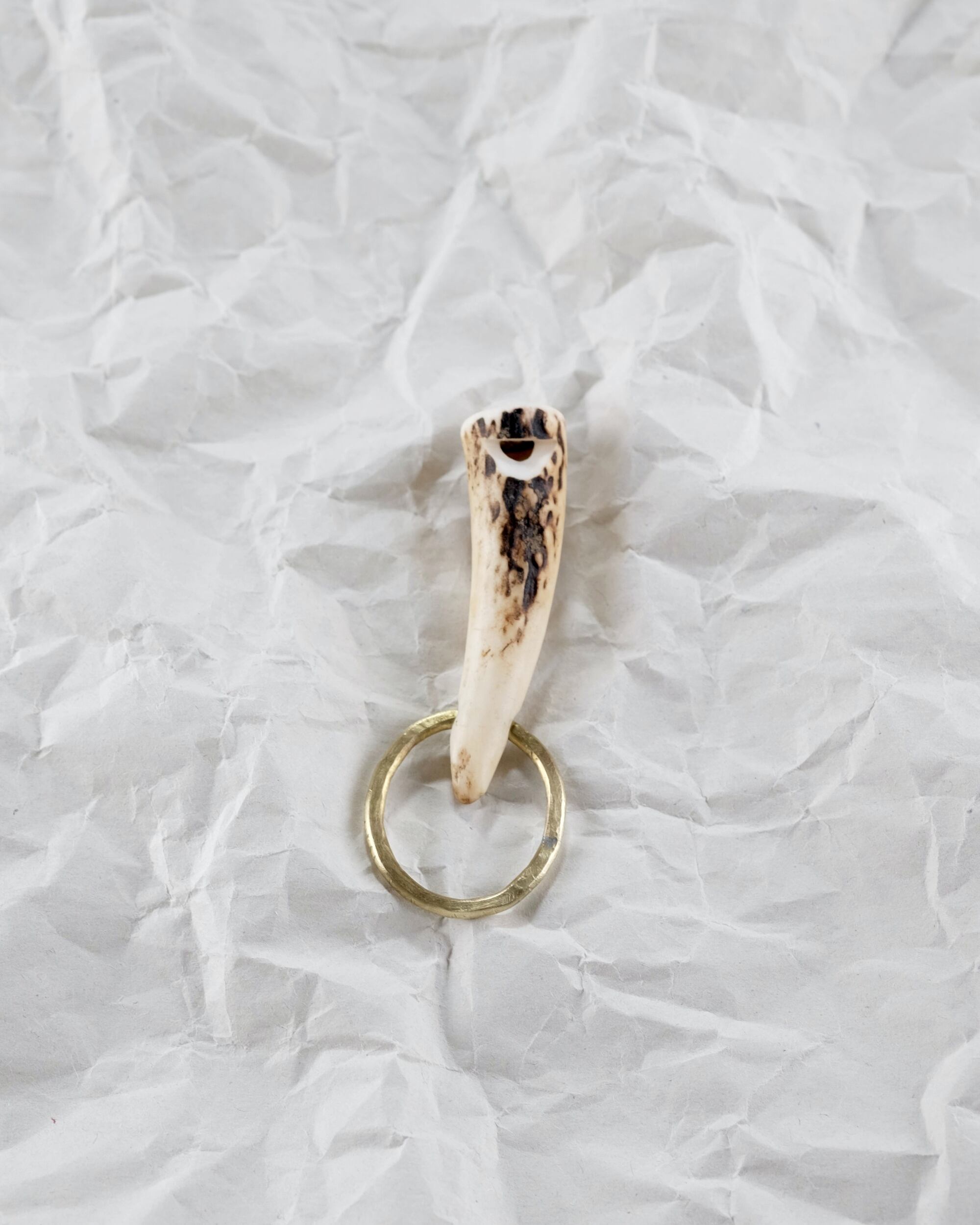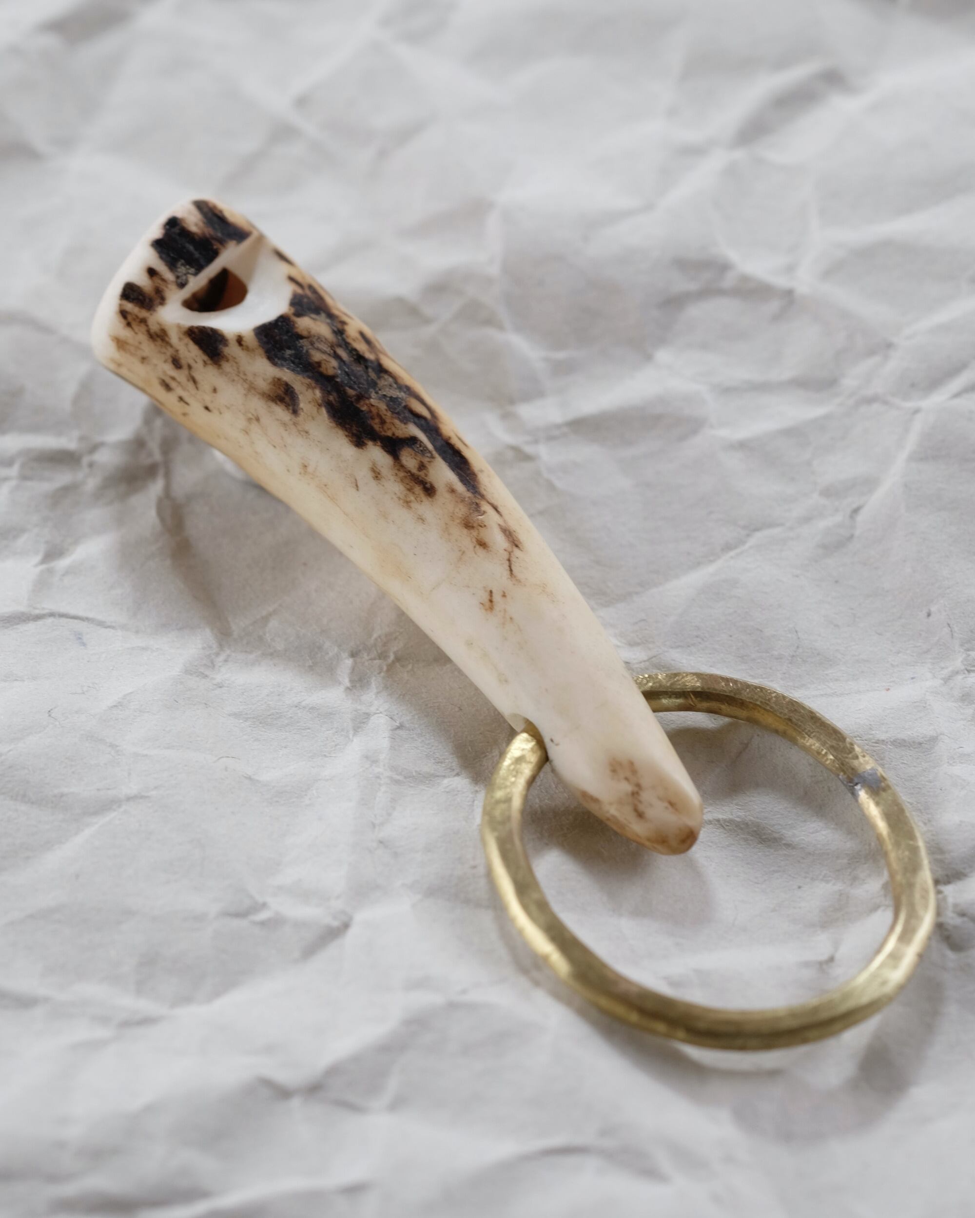 無骨ながらも暖かみのある deer whistles はひとつひとつ形や音に個性があり、機能を持ったお守りとして作られました。素材は北海道のエゾ鹿の角で出来ています。気持ちよくシェイプされているので口に当てた時に不思議としっくりきます。真鍮無垢の金具も職人の手仕事によるもの。