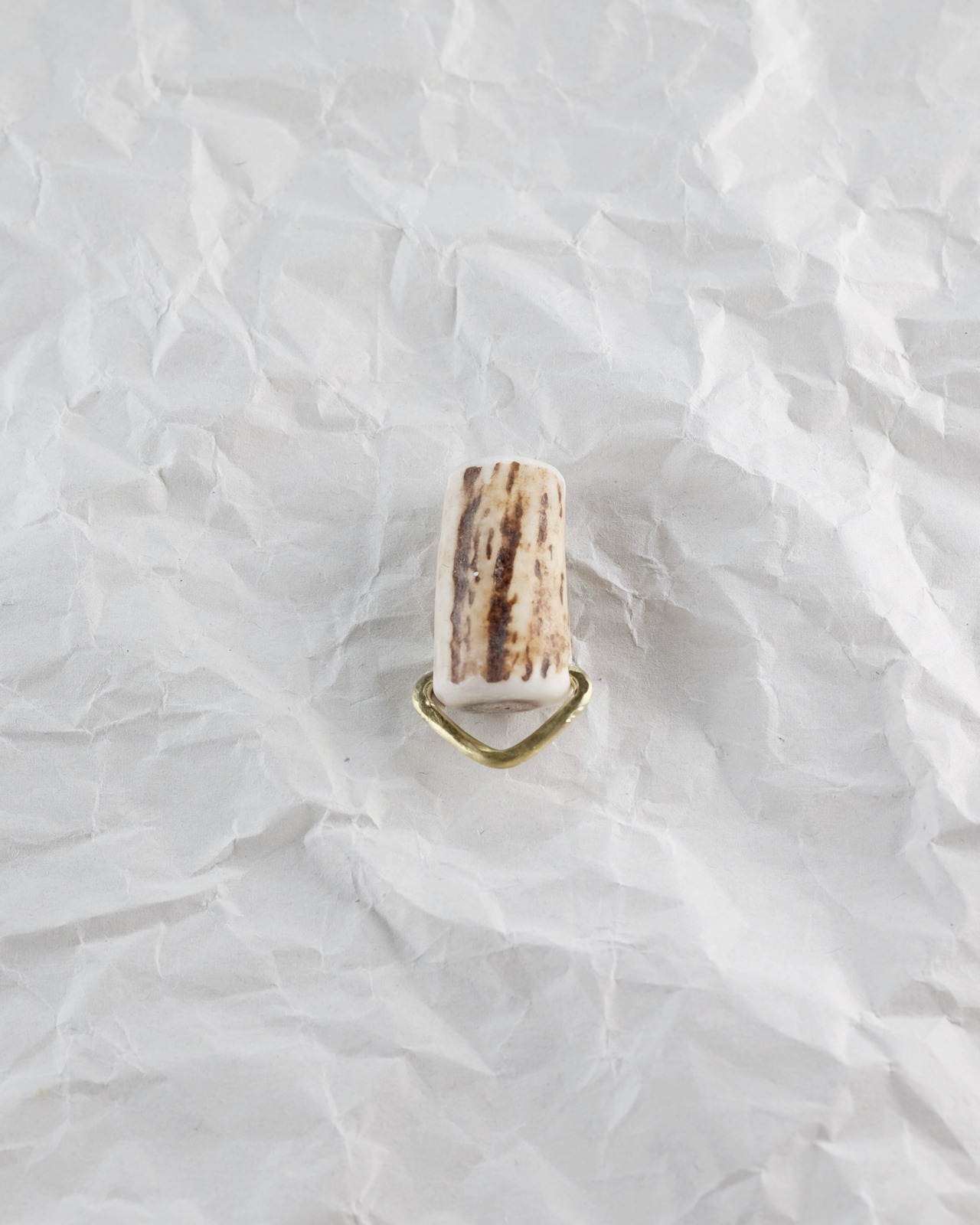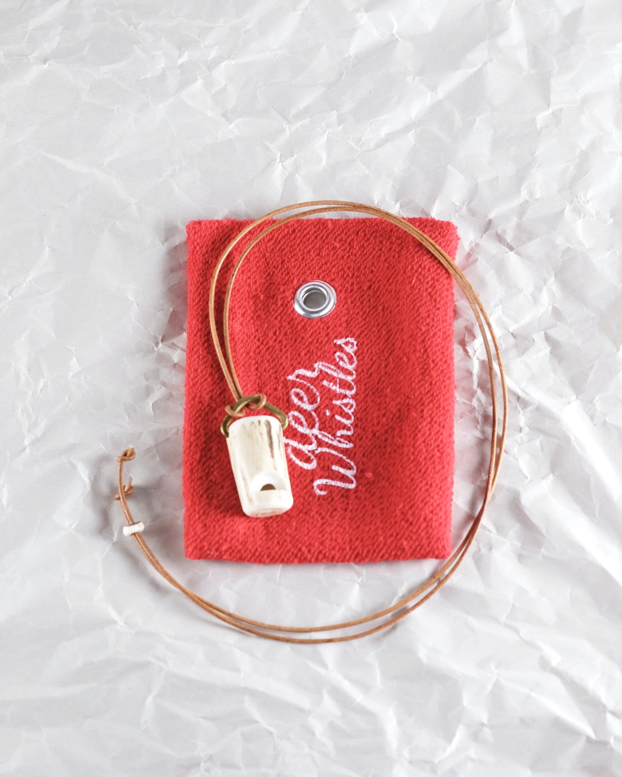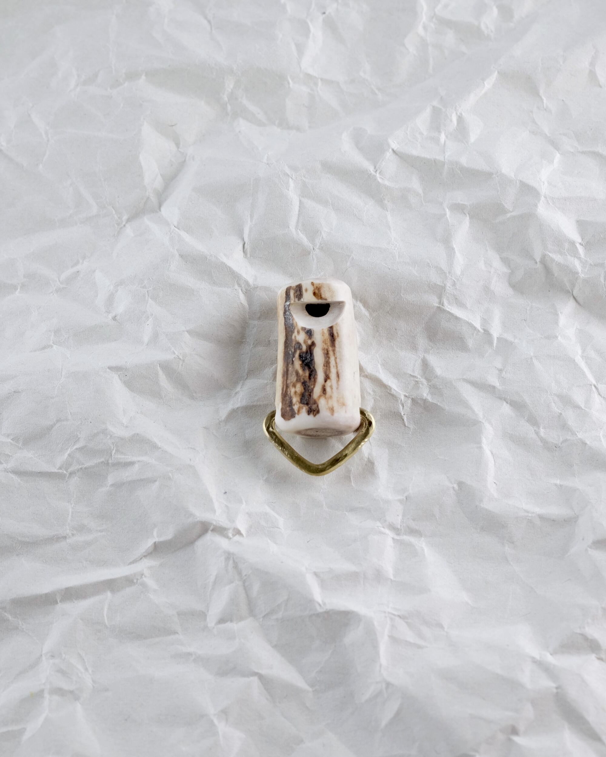 無骨ながらも暖かみのある deer whistles はひとつひとつ形や音に個性があり、機能を持ったお守りとして作られました。素材は北海道のエゾ鹿の角で出来ています。気持ちよくシェイプされているので口に当てた時に不思議としっくりきます。真鍮無垢の金具も職人の手仕事によるもの。