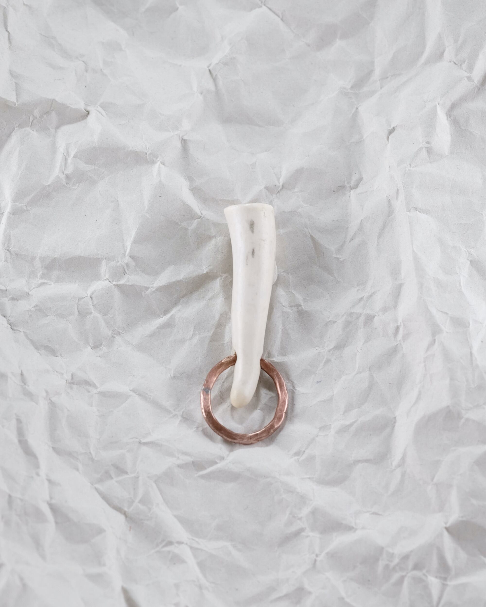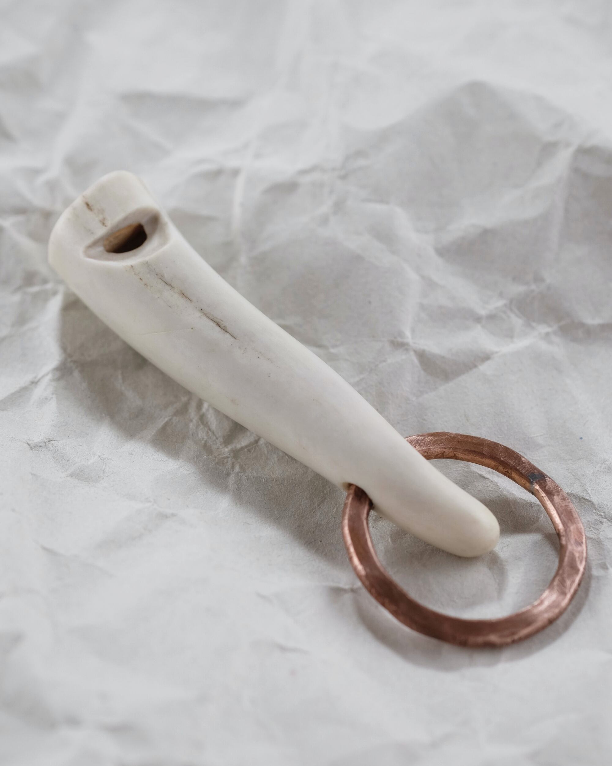 無骨ながらも暖かみのある deer whistles はひとつひとつ形や音に個性があり、機能を持ったお守りとして作られました。素材は北海道のエゾ鹿の角で出来ています。気持ちよくシェイプされているので口に当てた時に不思議としっくりきます。銅無垢の金具も職人の手仕事によるもの。