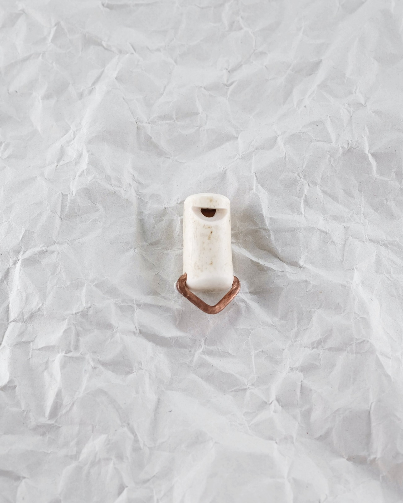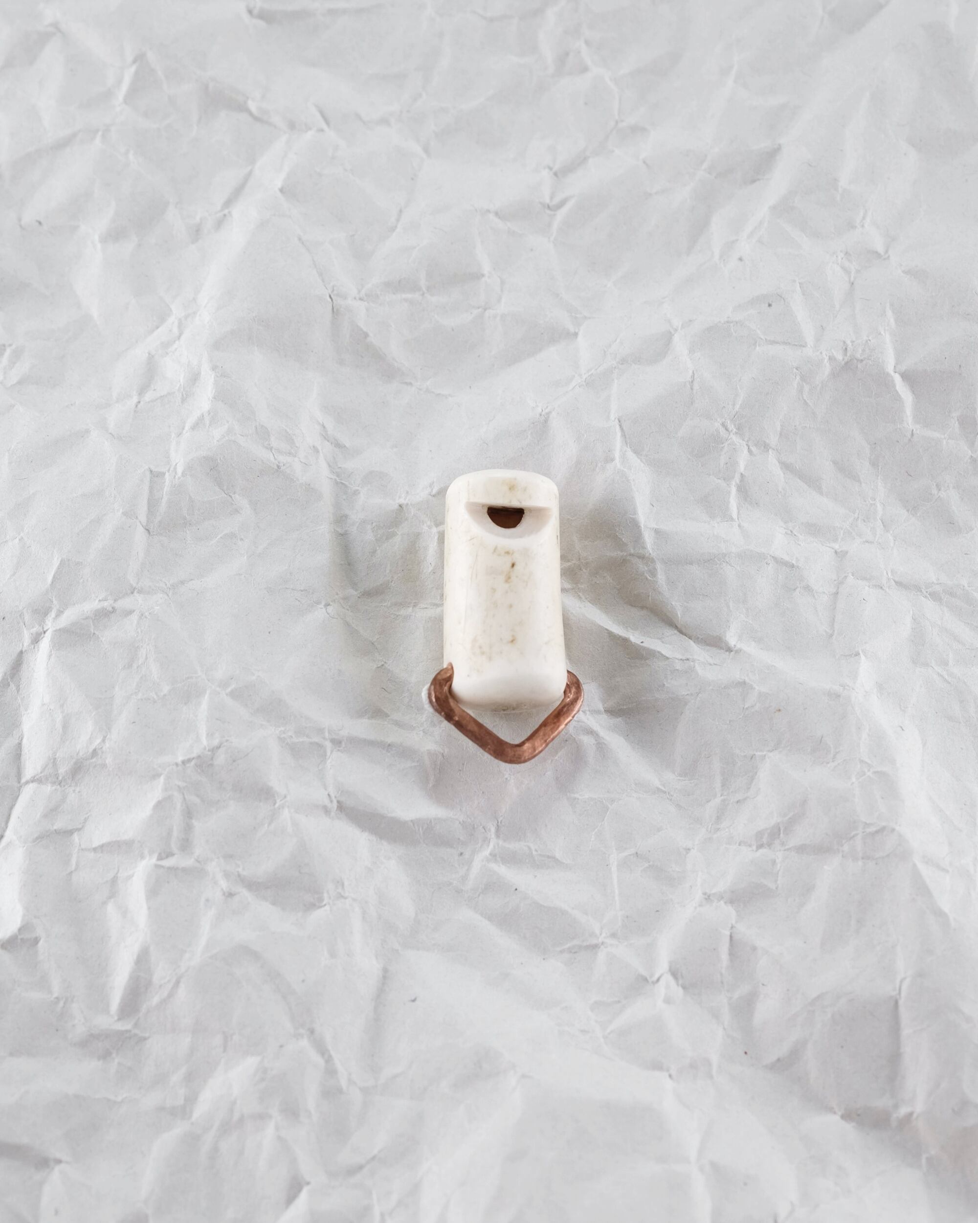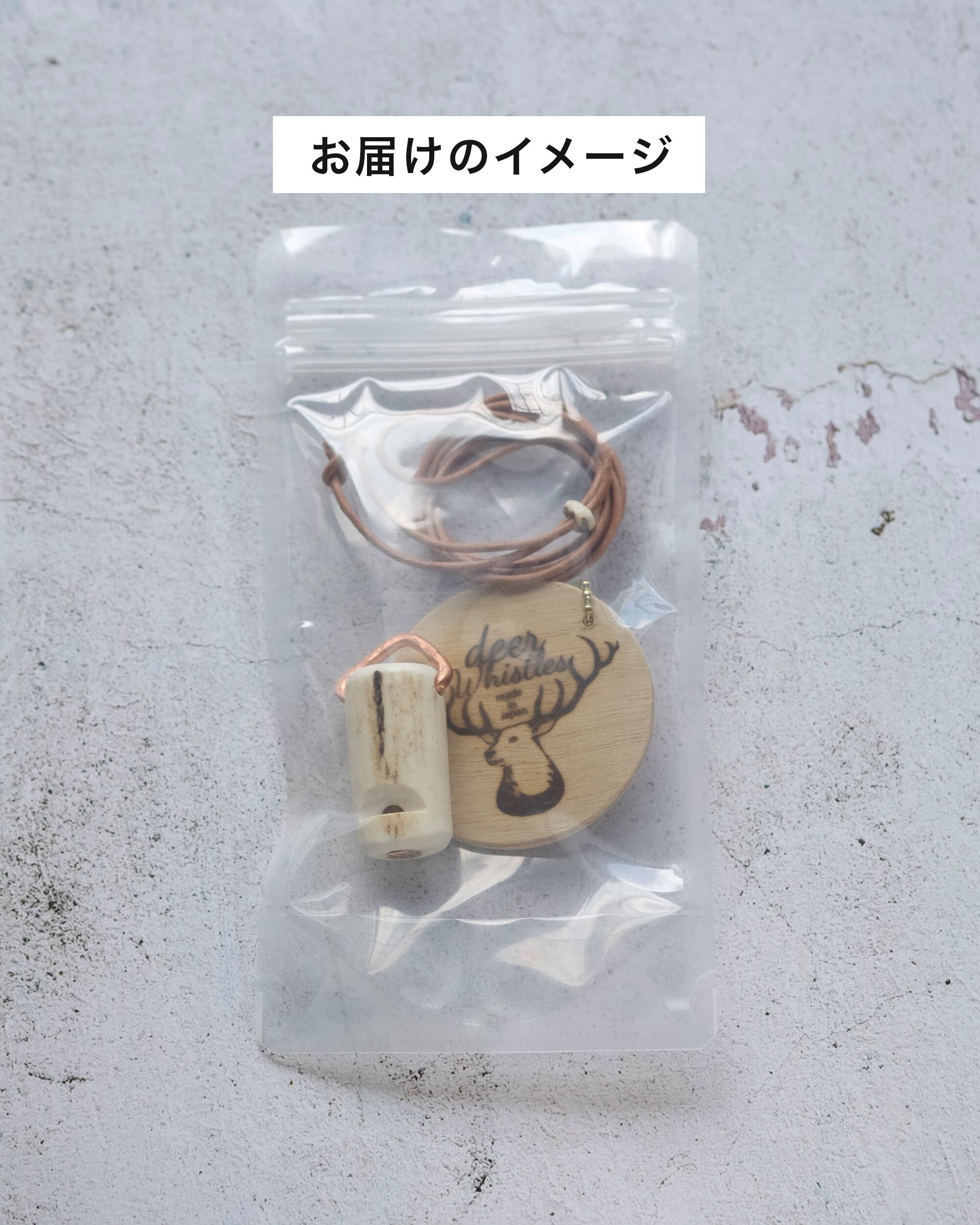 無骨ながらも暖かみのある deer whistles はひとつひとつ形や音に個性があり、機能を持ったお守りとして作られました。素材は北海道のエゾ鹿の角で出来ています。気持ちよくシェイプされているので口に当てた時に不思議としっくりきます。銅無垢の金具も職人の手仕事によるもの。
