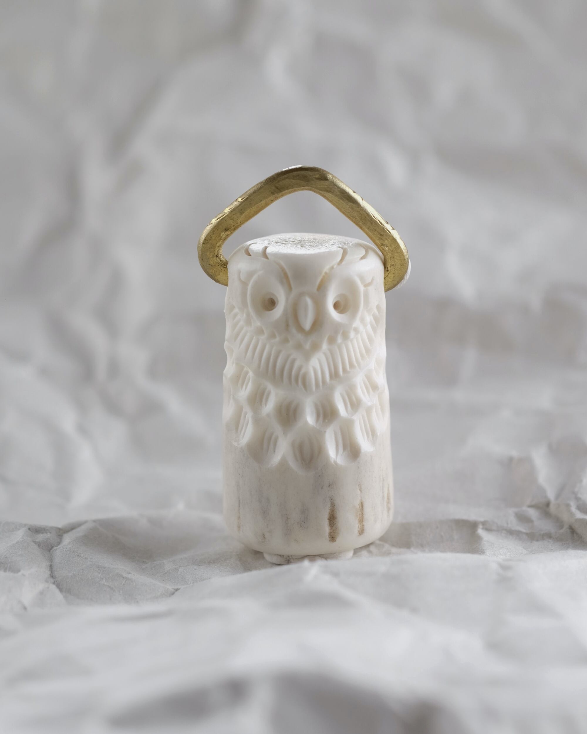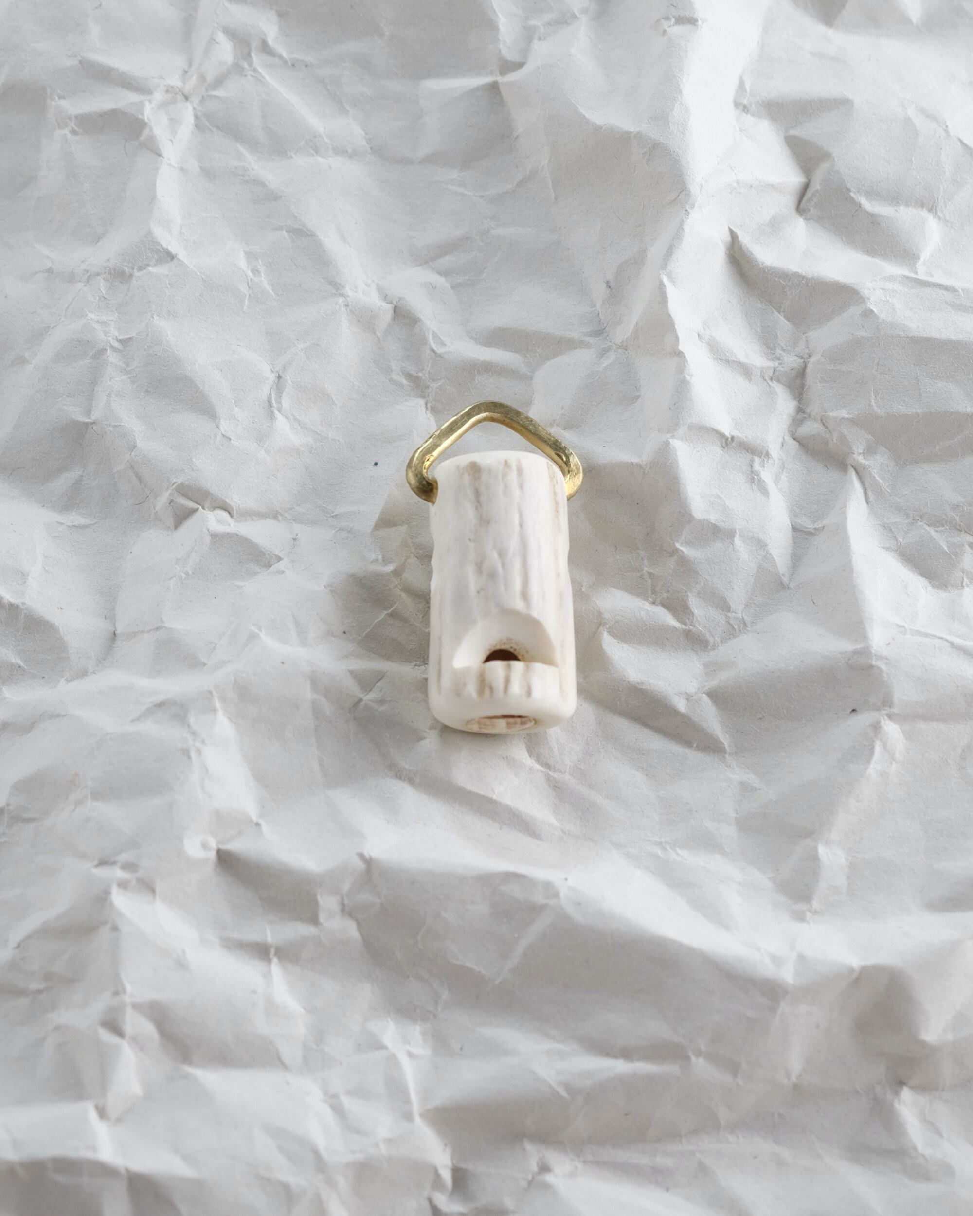 無骨ながらも暖かみのある deer whistles はひとつひとつ形や音に個性があり、機能を持ったお守りとして作られました。素材は北海道のエゾ鹿の角で出来ています。気持ちよくシェイプされているので口に当てた時に不思議としっくりきます。真鍮無垢の金具も職人の手仕事によるもの。