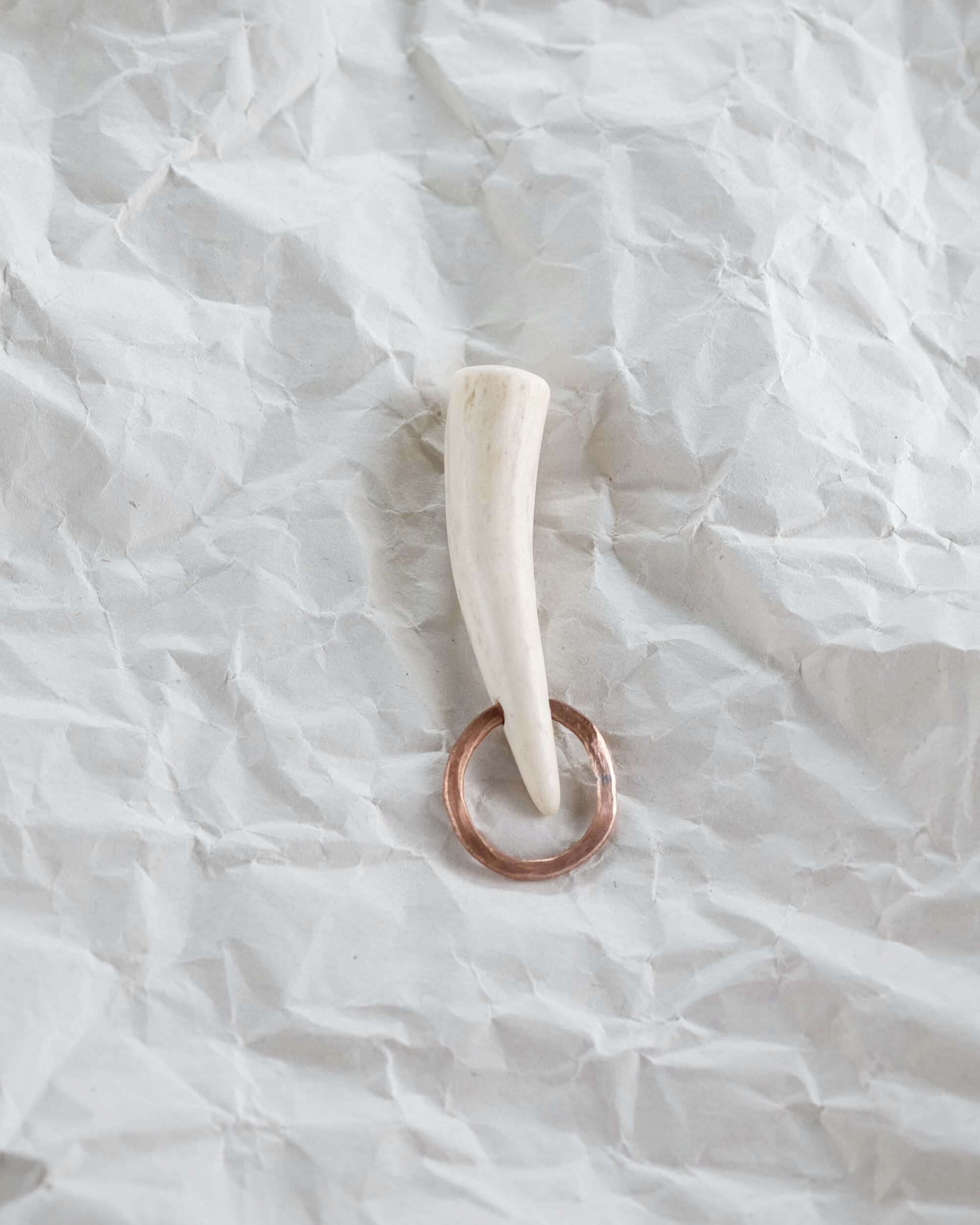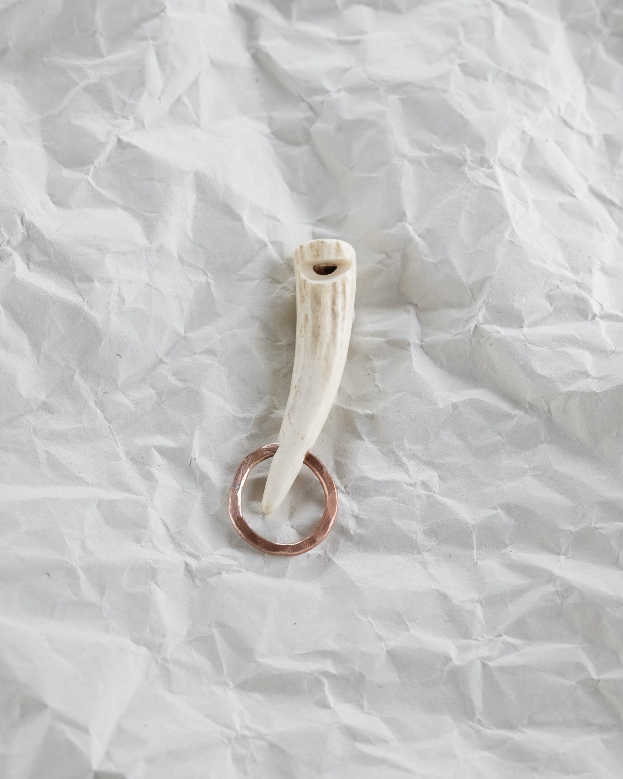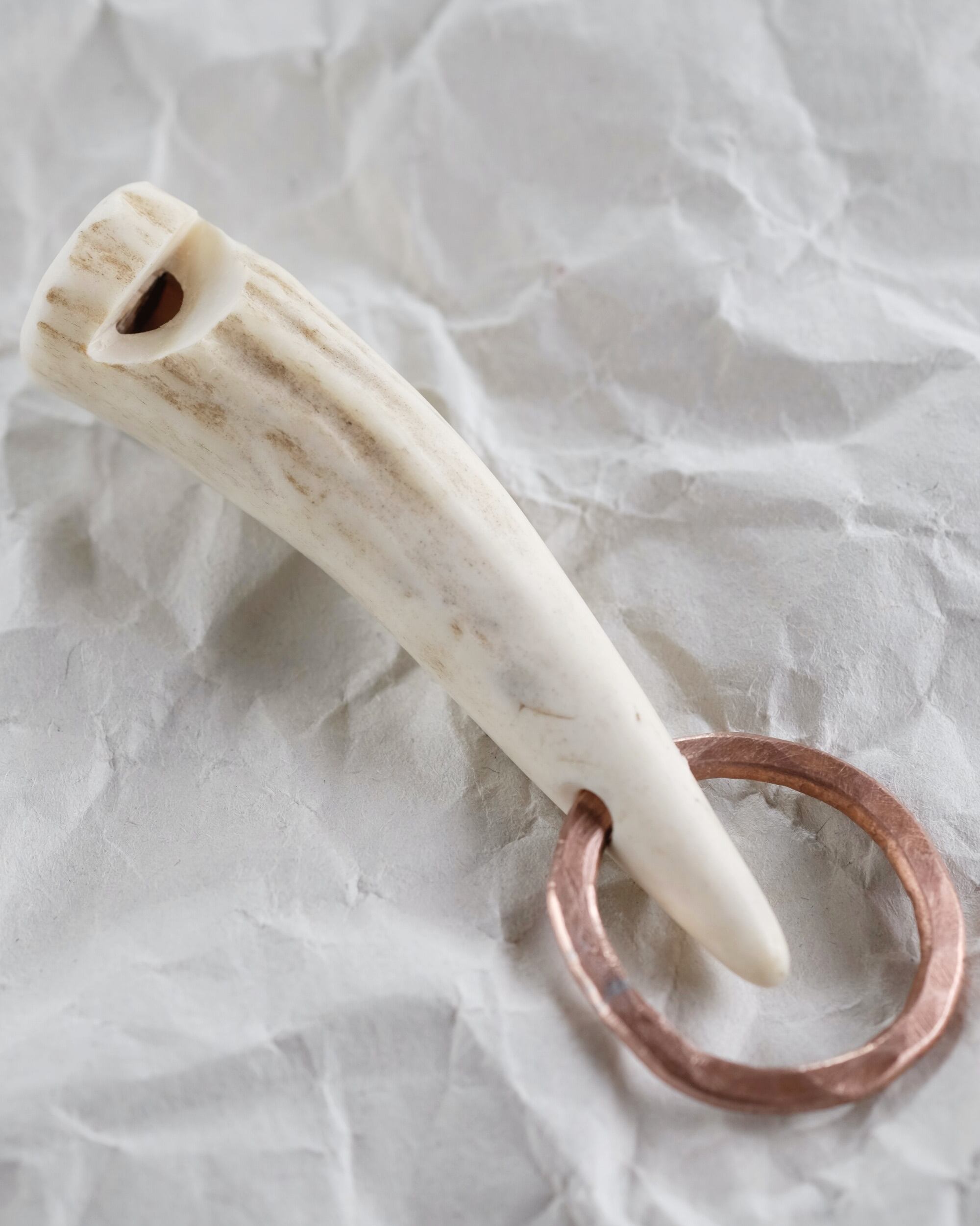 無骨ながらも暖かみのある deer whistles はひとつひとつ形や音に個性があり、機能を持ったお守りとして作られました。素材は北海道のエゾ鹿の角で出来ています。気持ちよくシェイプされているので口に当てた時に不思議としっくりきます。銅無垢の金具も職人の手仕事によるもの。