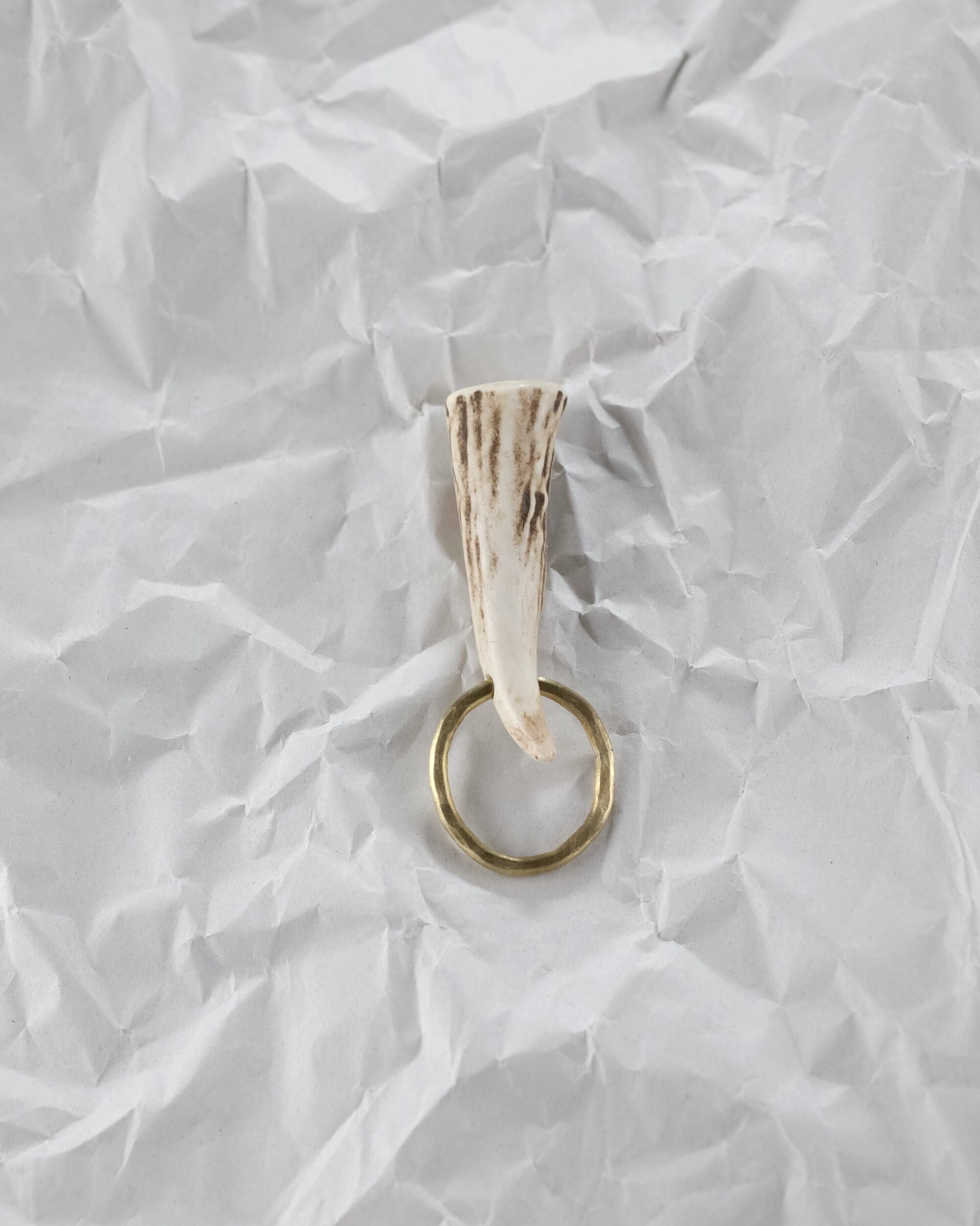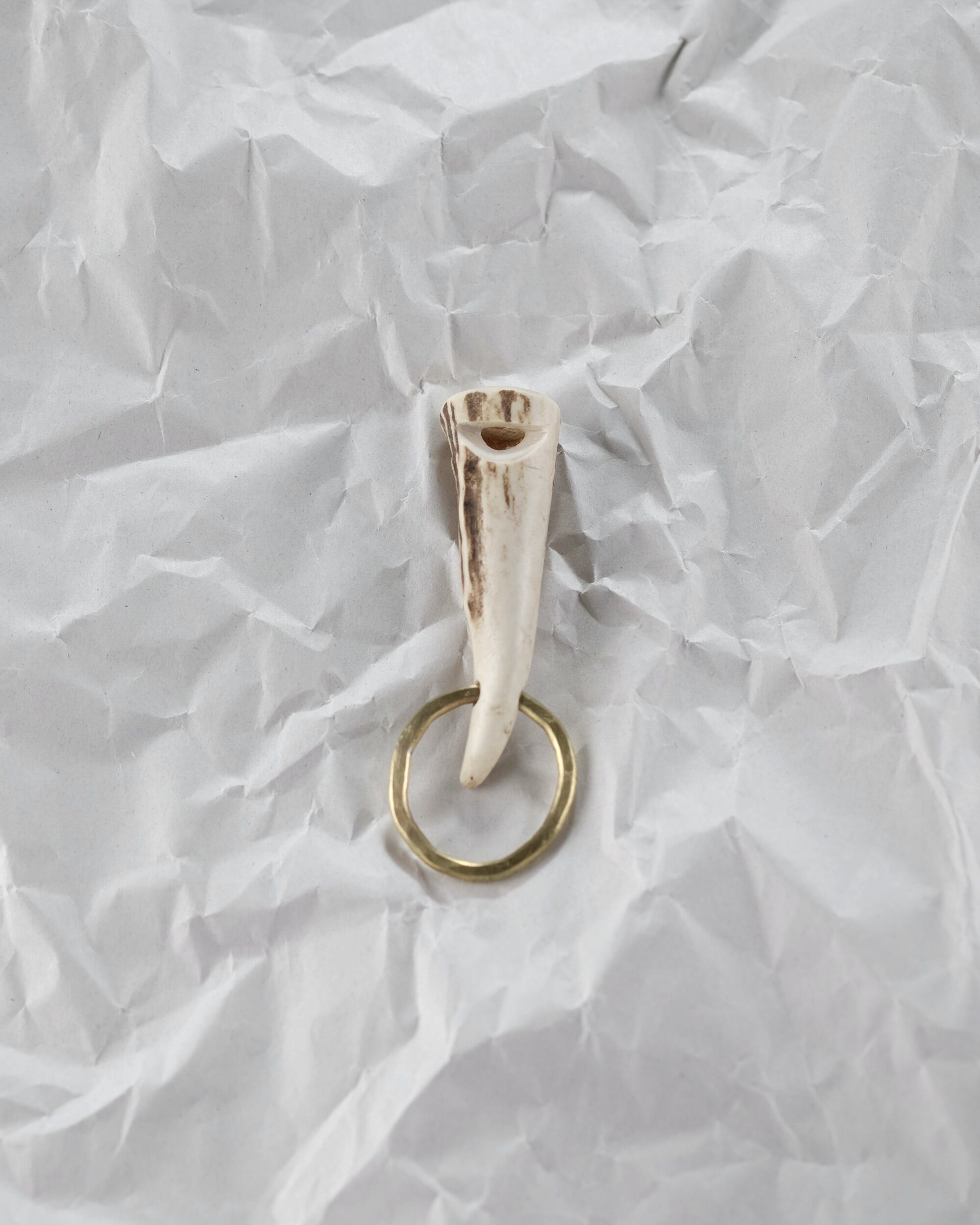 無骨ながらも暖かみのある deer whistles はひとつひとつ形や音に個性があり、機能を持ったお守りとして作られました。素材は北海道のエゾ鹿の角で出来ています。気持ちよくシェイプされているので口に当てた時に不思議としっくりきます。真鍮無垢の金具も職人の手仕事によるもの。