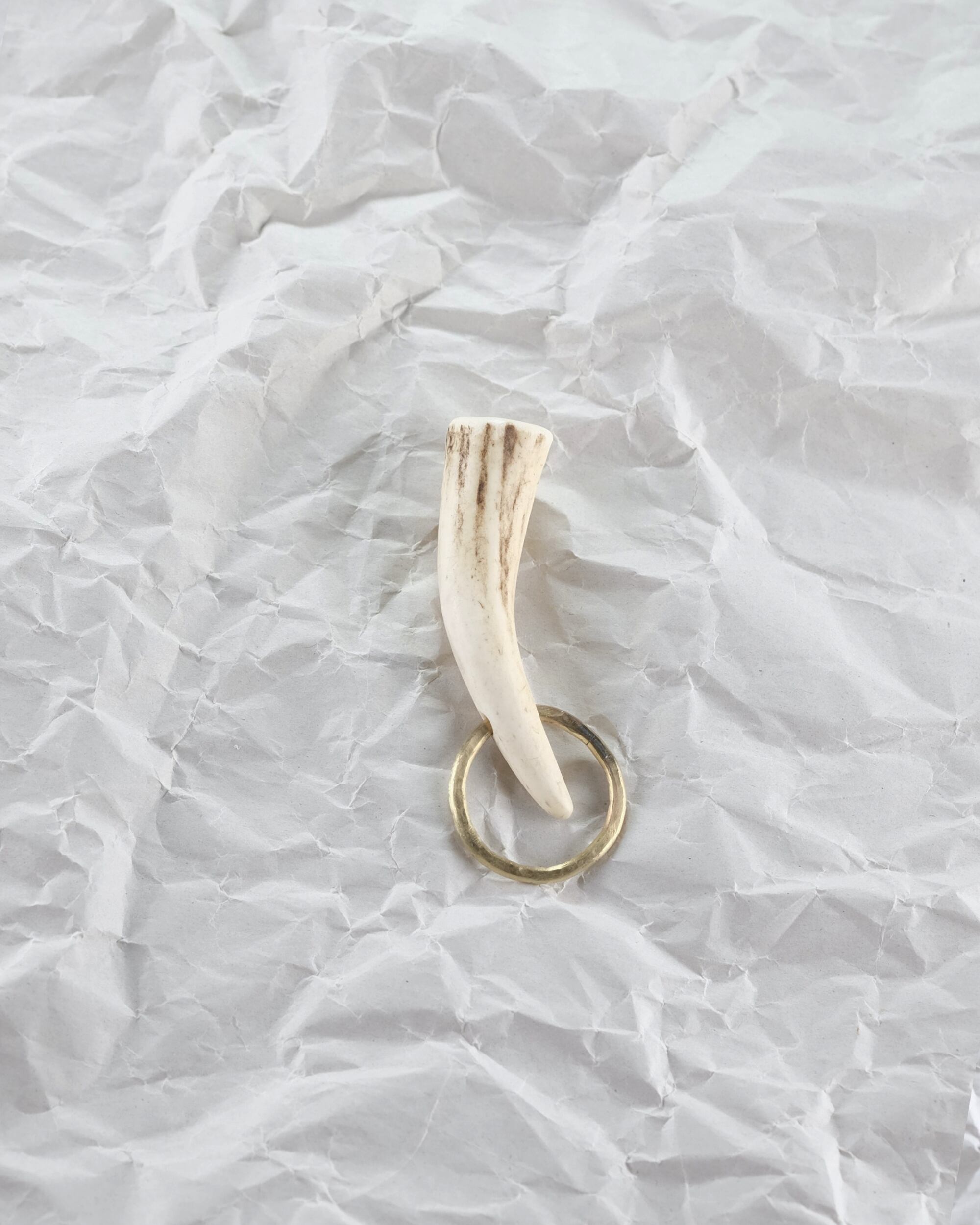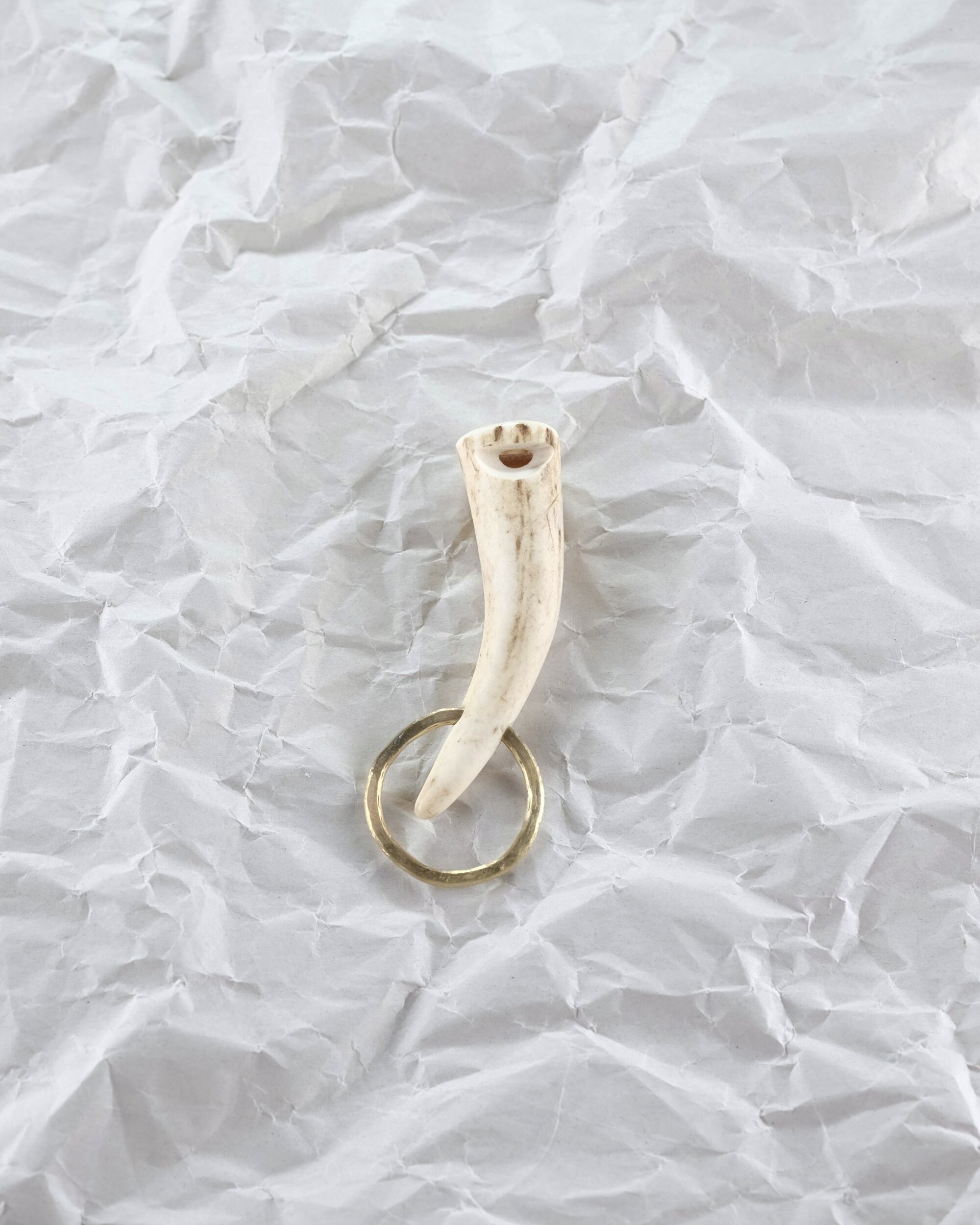 無骨ながらも暖かみのある deer whistles はひとつひとつ形や音に個性があり、機能を持ったお守りとして作られました。素材は北海道のエゾ鹿の角で出来ています。気持ちよくシェイプされているので口に当てた時に不思議としっくりきます。真鍮無垢の金具も職人の手仕事によるもの。