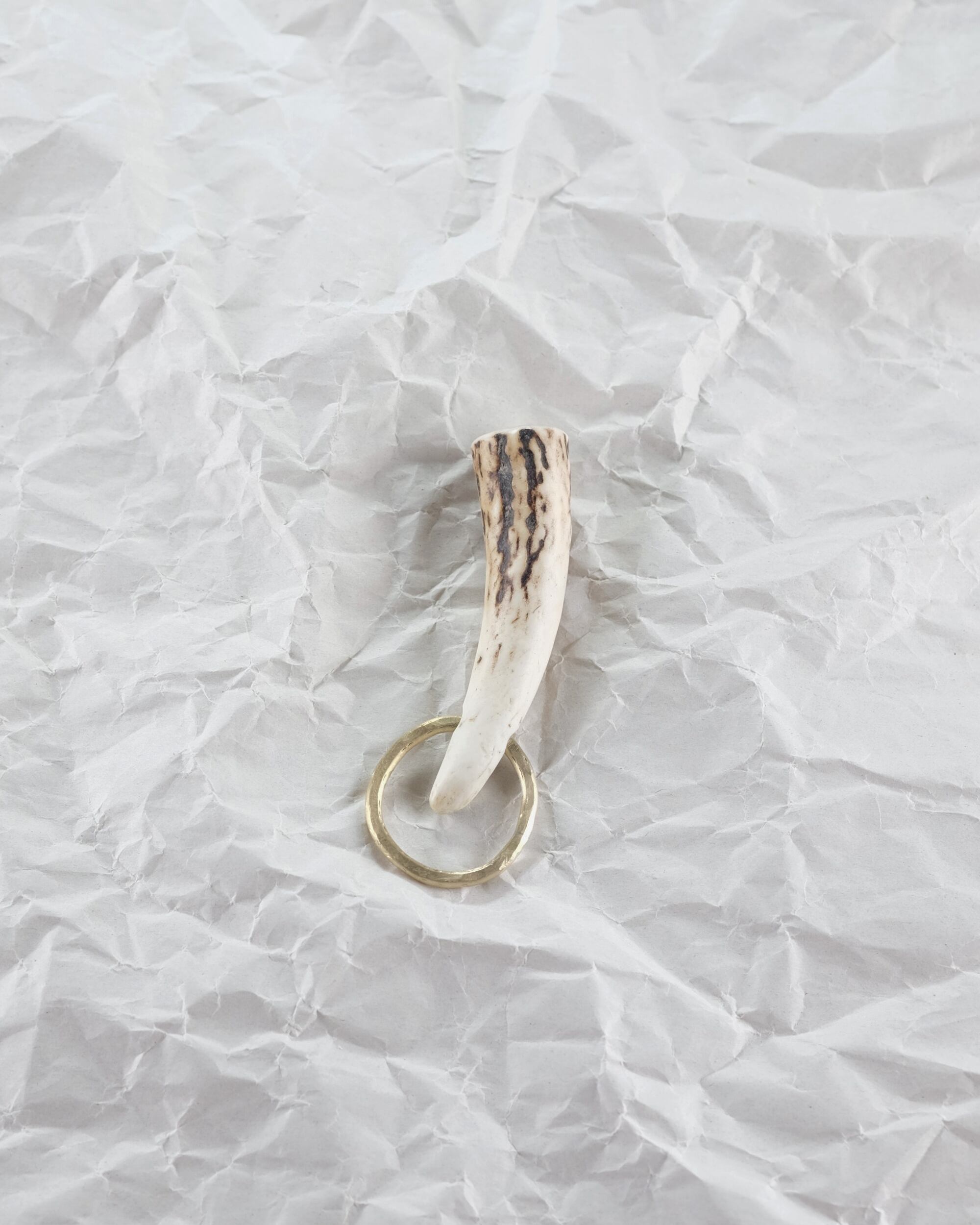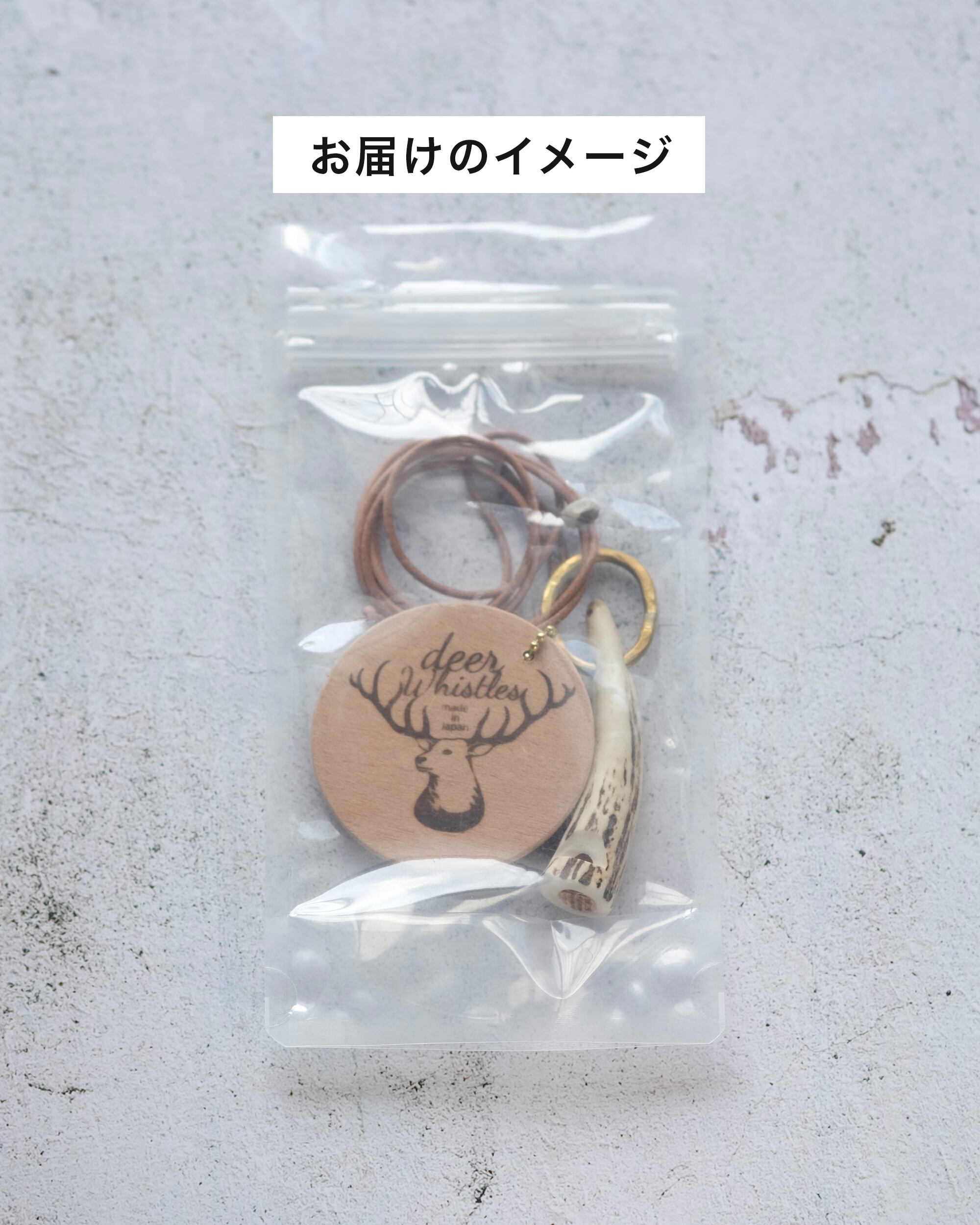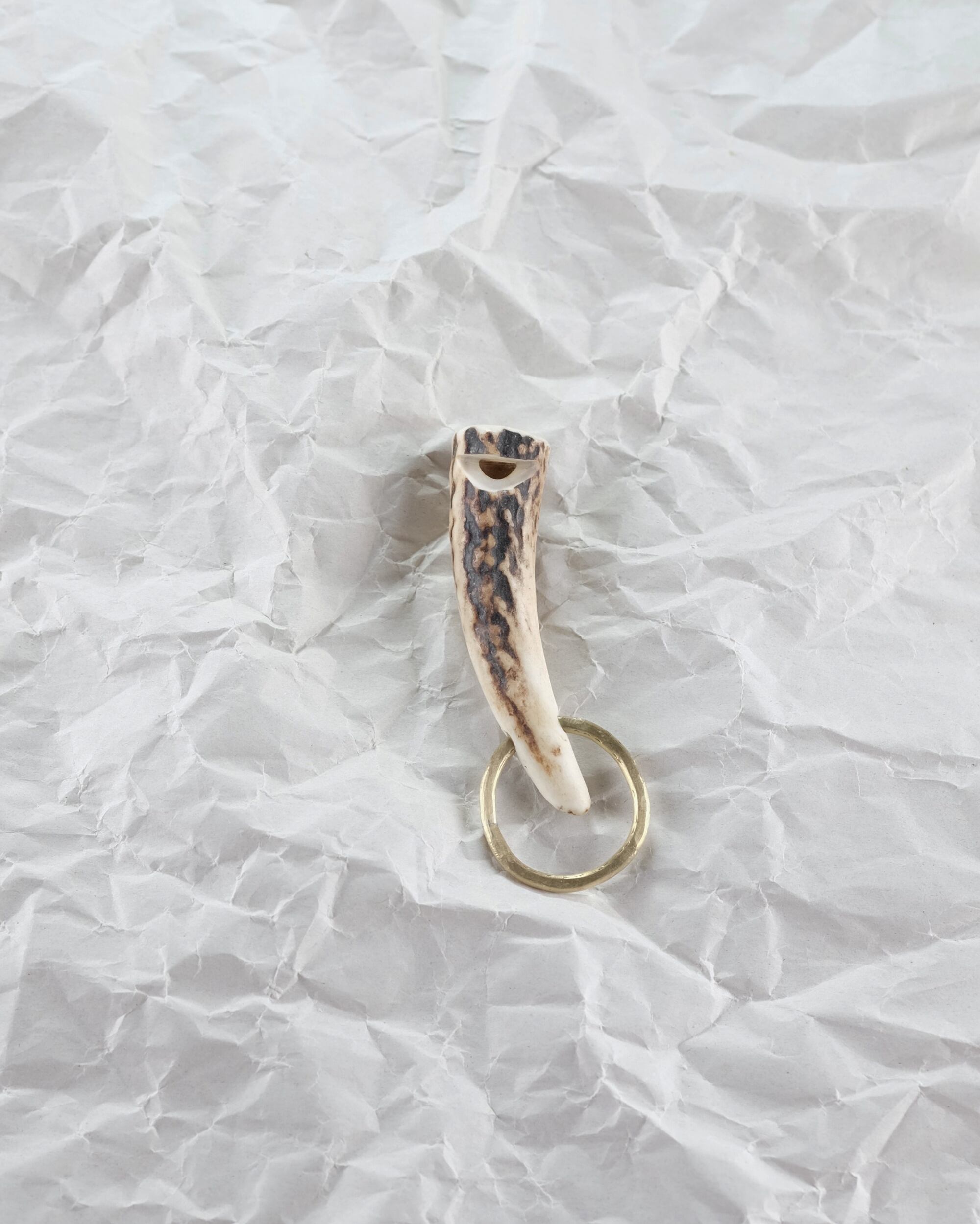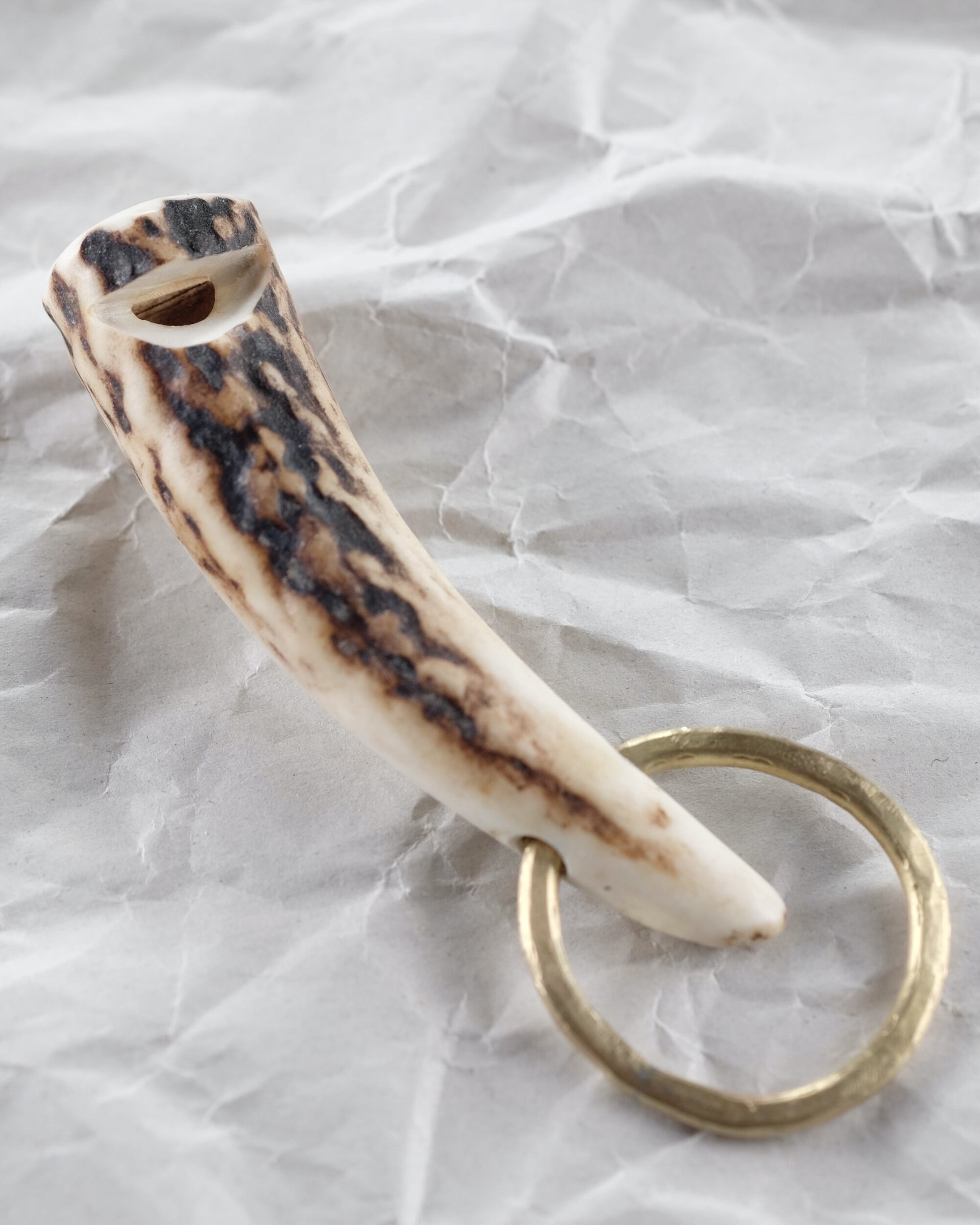 無骨ながらも暖かみのある deer whistles はひとつひとつ形や音に個性があり、機能を持ったお守りとして作られました。素材は北海道のエゾ鹿の角で出来ています。気持ちよくシェイプされているので口に当てた時に不思議としっくりきます。真鍮無垢の金具も職人の手仕事によるもの。