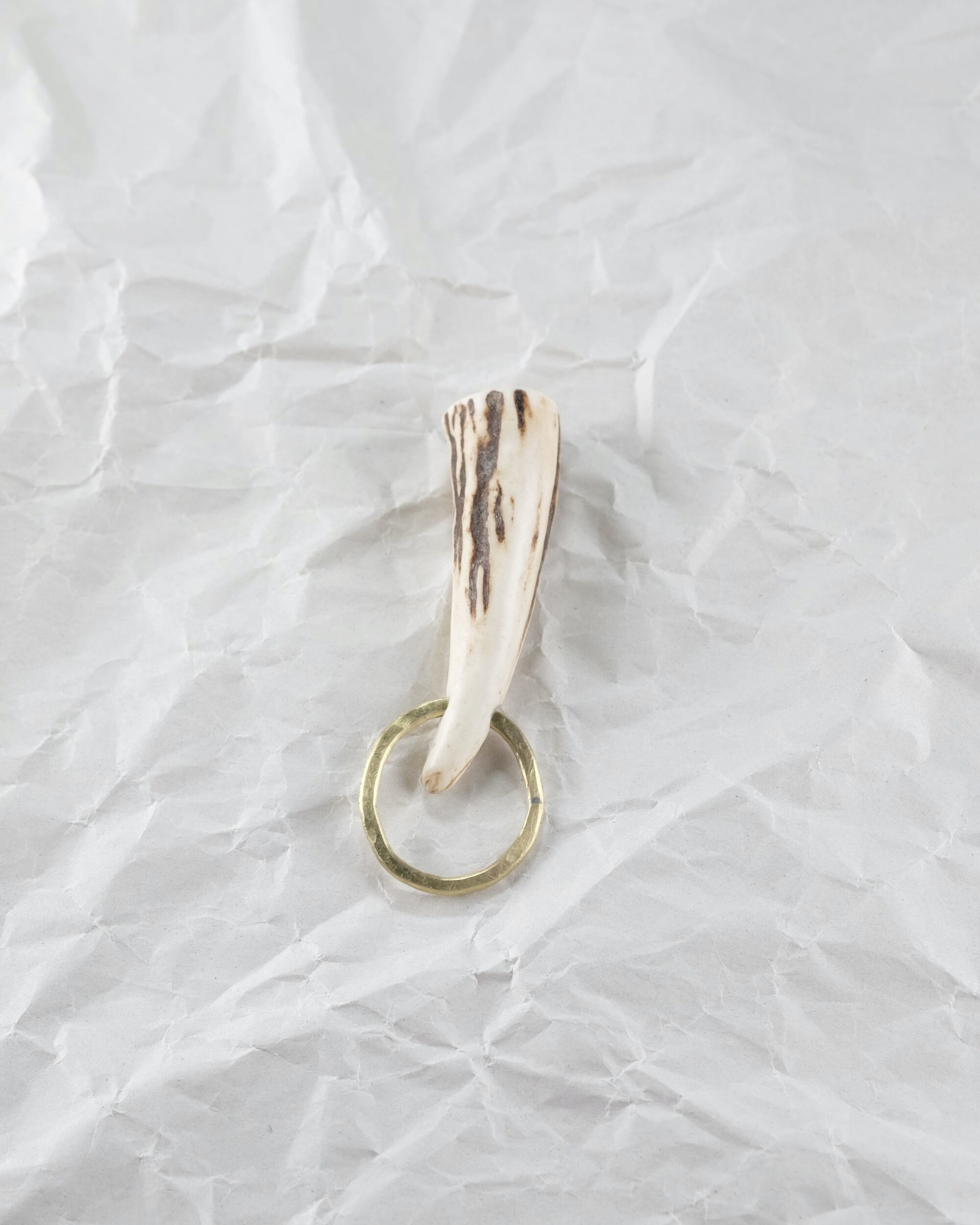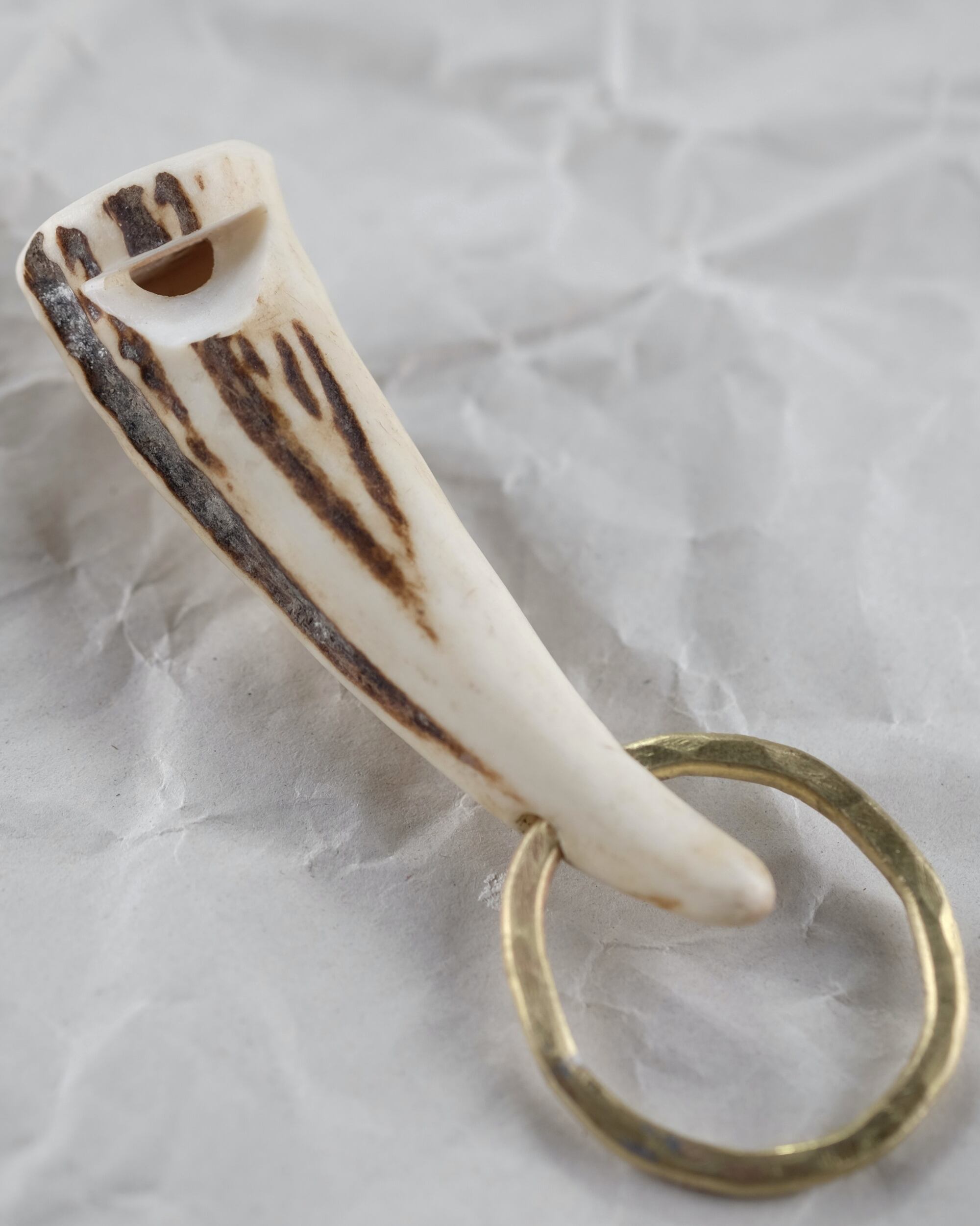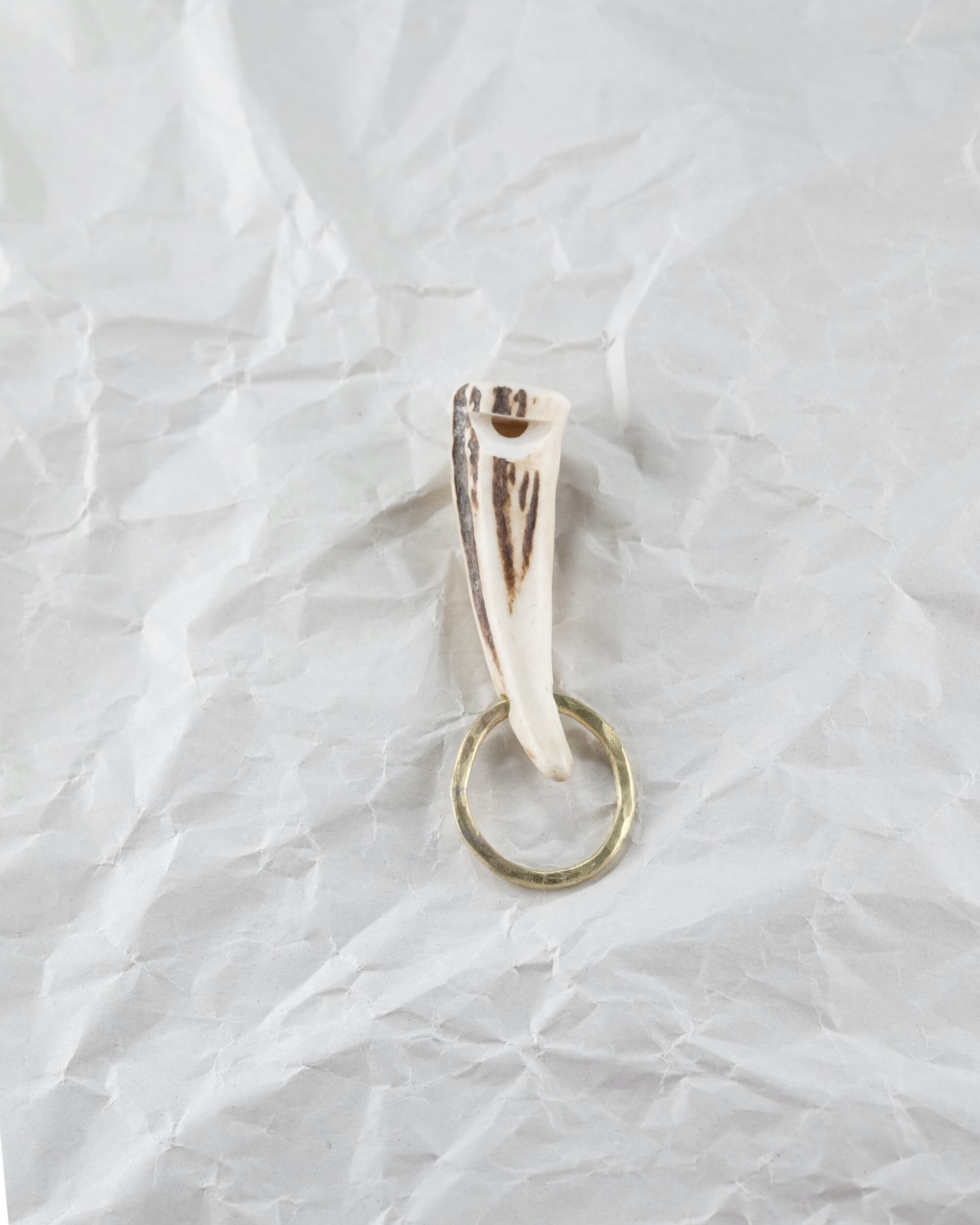 無骨ながらも暖かみのある deer whistles はひとつひとつ形や音に個性があり、機能を持ったお守りとして作られました。素材は北海道のエゾ鹿の角で出来ています。気持ちよくシェイプされているので口に当てた時に不思議としっくりきます。真鍮無垢の金具も職人の手仕事によるもの。