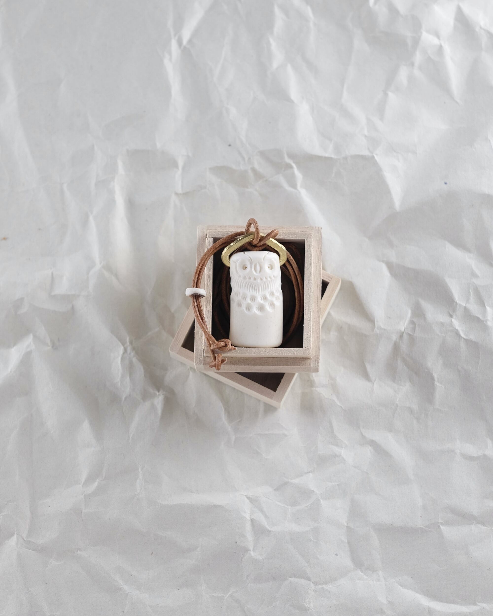 レザーコードが付属します。コードは鹿の角ビーズをスライドさせることで長さを変えられます。ペンダントとして身に着けていただいたり、お手持ちのバッグやキーにチャームとしてお付けください。桐箱に入れてお届けします。