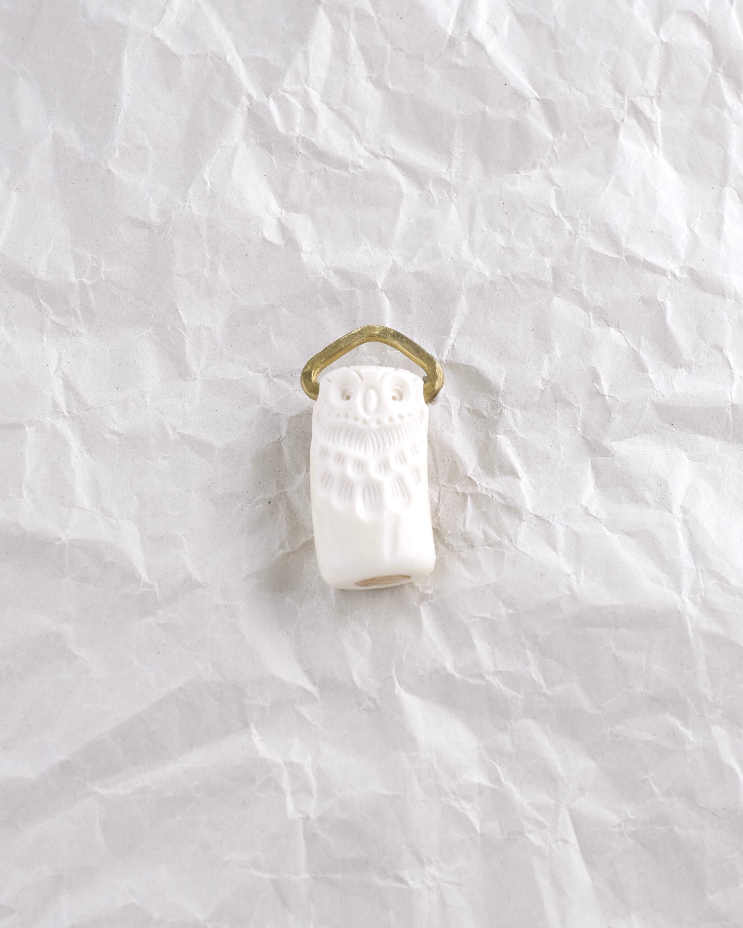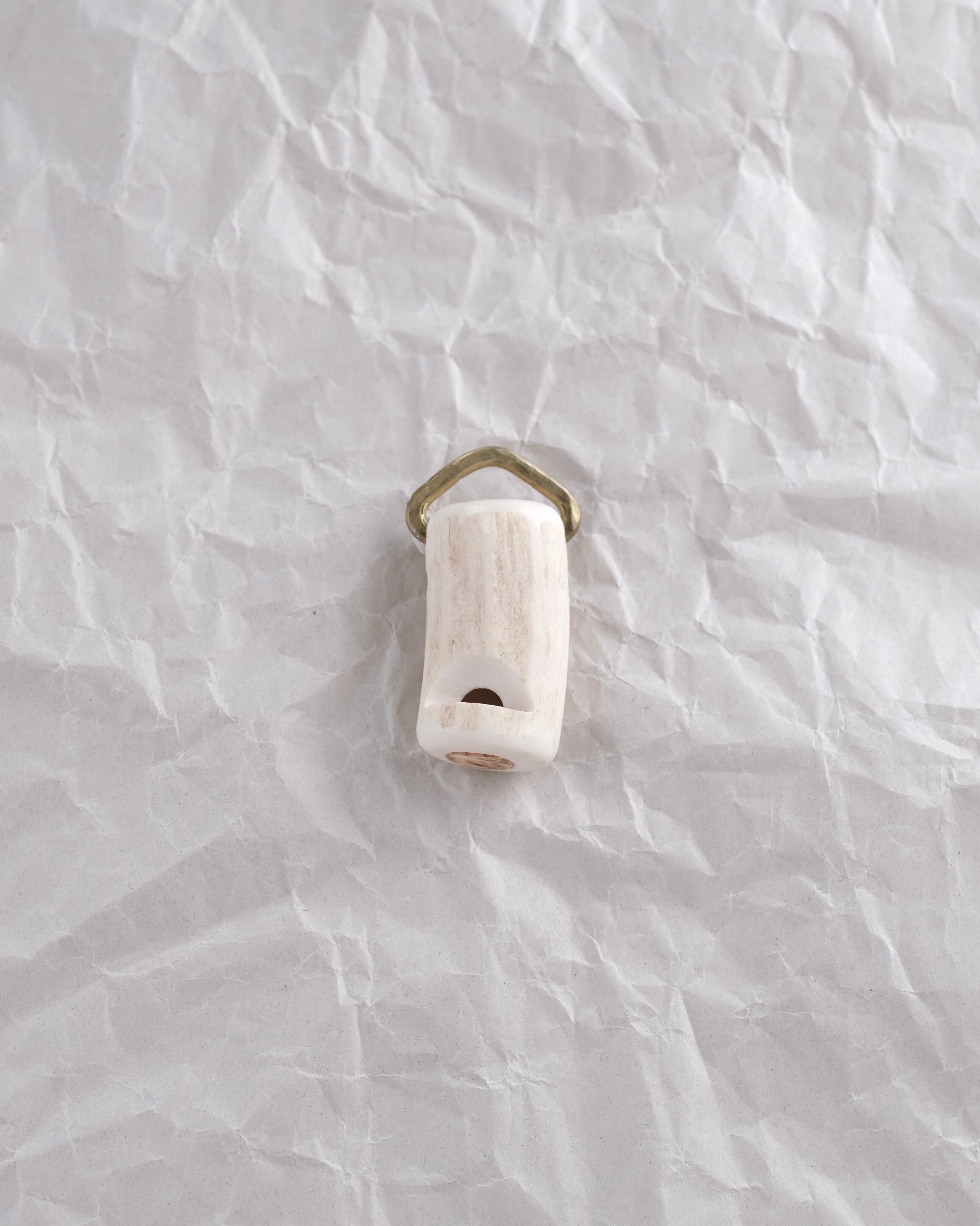 無骨ながらも暖かみのある deer whistles はひとつひとつ形や音に個性があり、機能を持ったお守りとして作られました。素材は北海道のエゾ鹿の角で出来ています。気持ちよくシェイプされているので口に当てた時に不思議としっくりきます。真鍮無垢の金具も職人の手仕事によるもの。