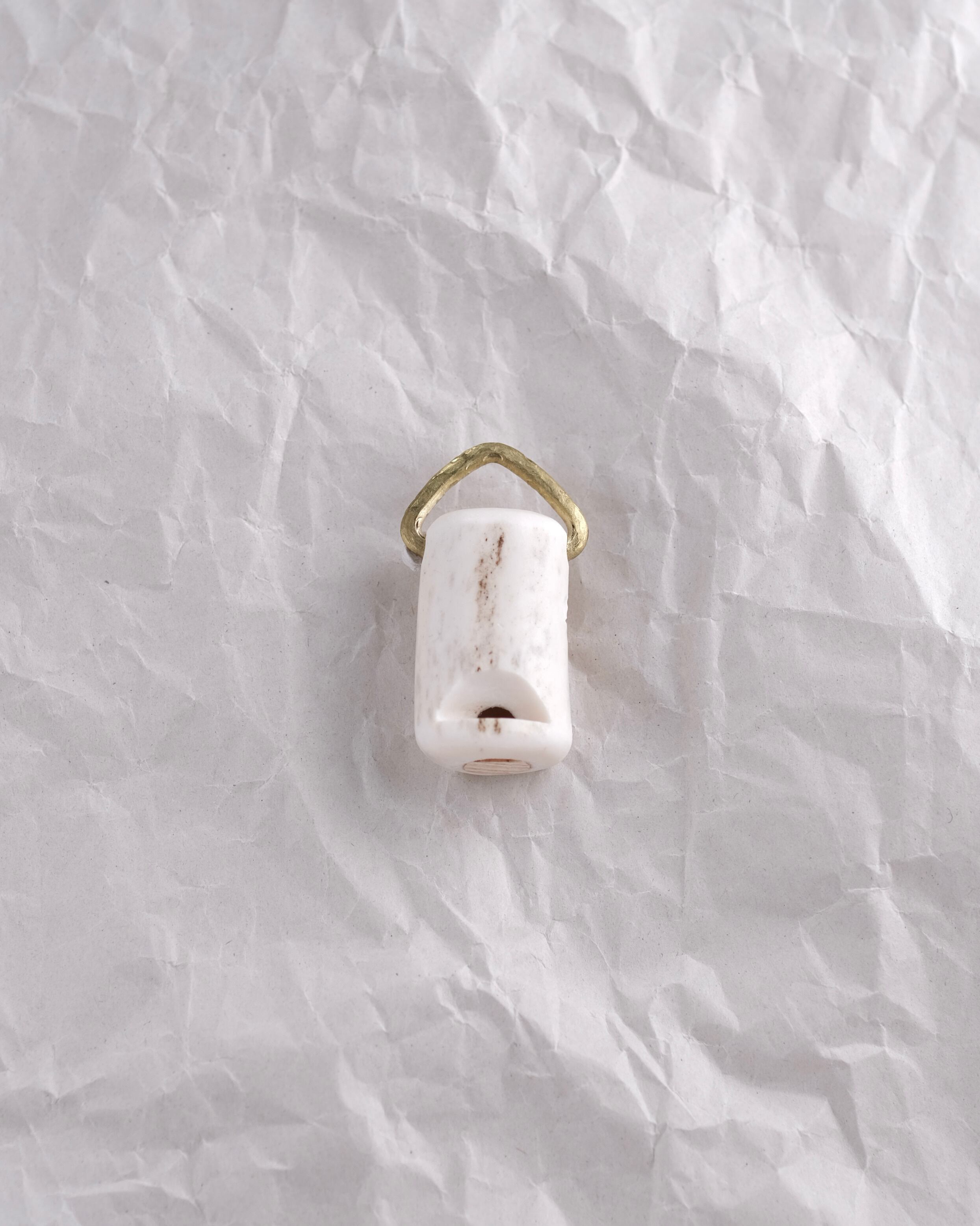 無骨ながらも暖かみのある deer whistles はひとつひとつ形や音に個性があり、機能を持ったお守りとして作られました。素材は北海道のエゾ鹿の角で出来ています。気持ちよくシェイプされているので口に当てた時に不思議としっくりきます。真鍮無垢の金具も職人の手仕事によるもの。